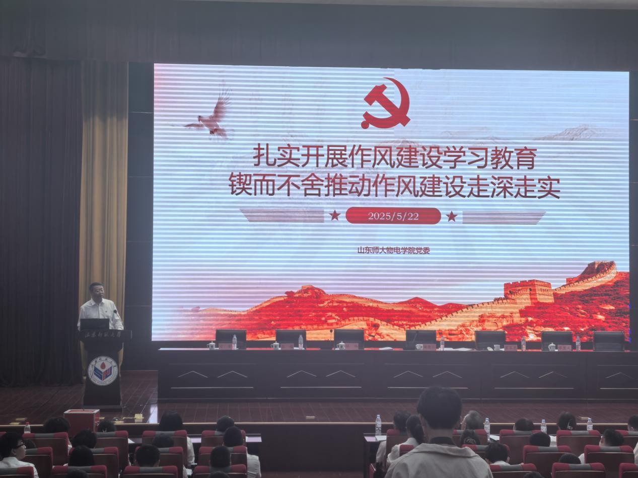 为把党中央关于作风建设的要求落到实处,持续深化主题教育成效,2025年5月22日下午,物理与电子科学学院党委书记谢德仁在山东师范大学长清湖校区,为全院师生党员带来了一场专题党课。此次党课以“扎实开展作风建设学习教育,锲而不舍推动作风建设走深走实”为主题,干货满满、贴近实际,让在场学习者深受触动。谢德仁书记围绕“作风建设”这一核心,先从党中央部署开展中央八项规定精神学习教育的重要性说起。他谈到,这不仅是推动全面从严治党往深里走、...