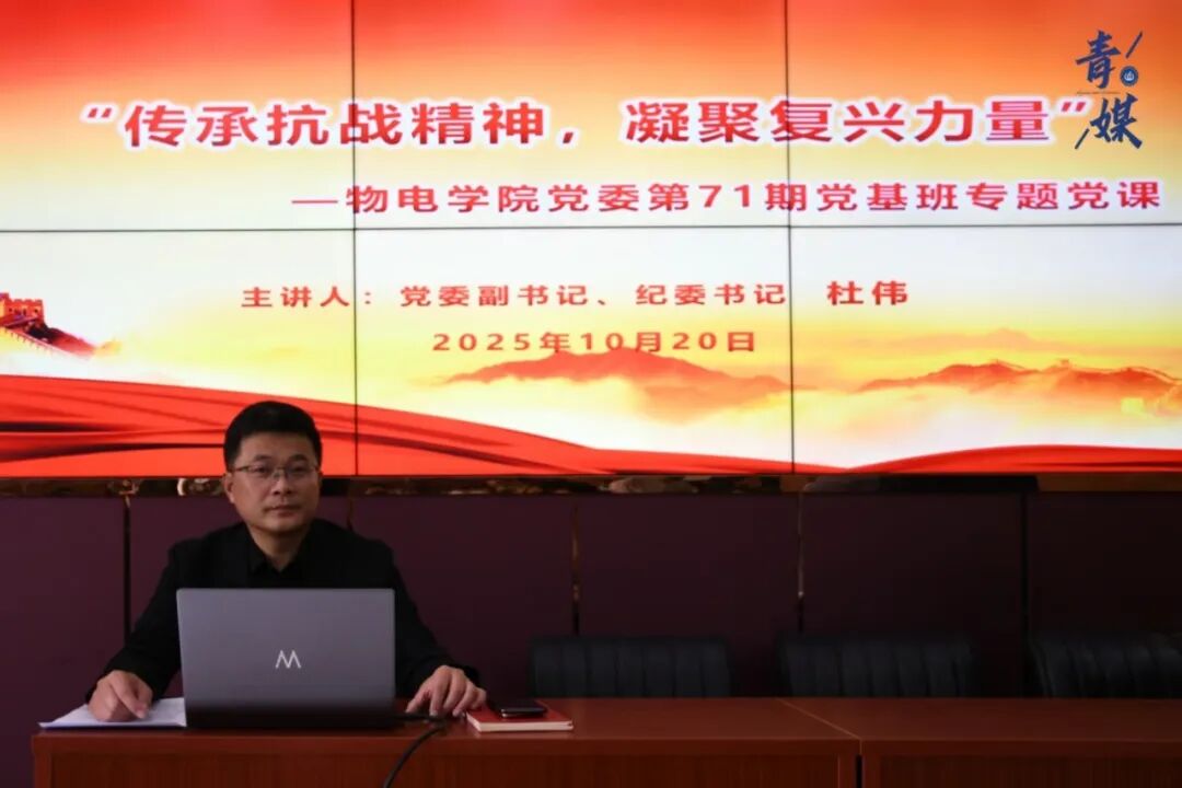 10月20日中午,物理与电子科学学院于文澜楼A区F347室召开“传承抗战精神,凝聚复兴力量”主题党课,本次党课由党委副书记、纪委书记杜伟担任主讲人,2024级辅导员苏恒担任主持人,学院第71期党基班56人参加学习本次党课。首先,杜伟围绕习近平总书记在纪念中国人民抗日战争暨世界反法西斯战争胜利80周年大会上的重要讲话展开叙述,承载过去,启迪未来。他表明,抗战史是艰苦卓绝的。日本通过明治维新发展壮大,而中国却处于一团散沙的局面。...