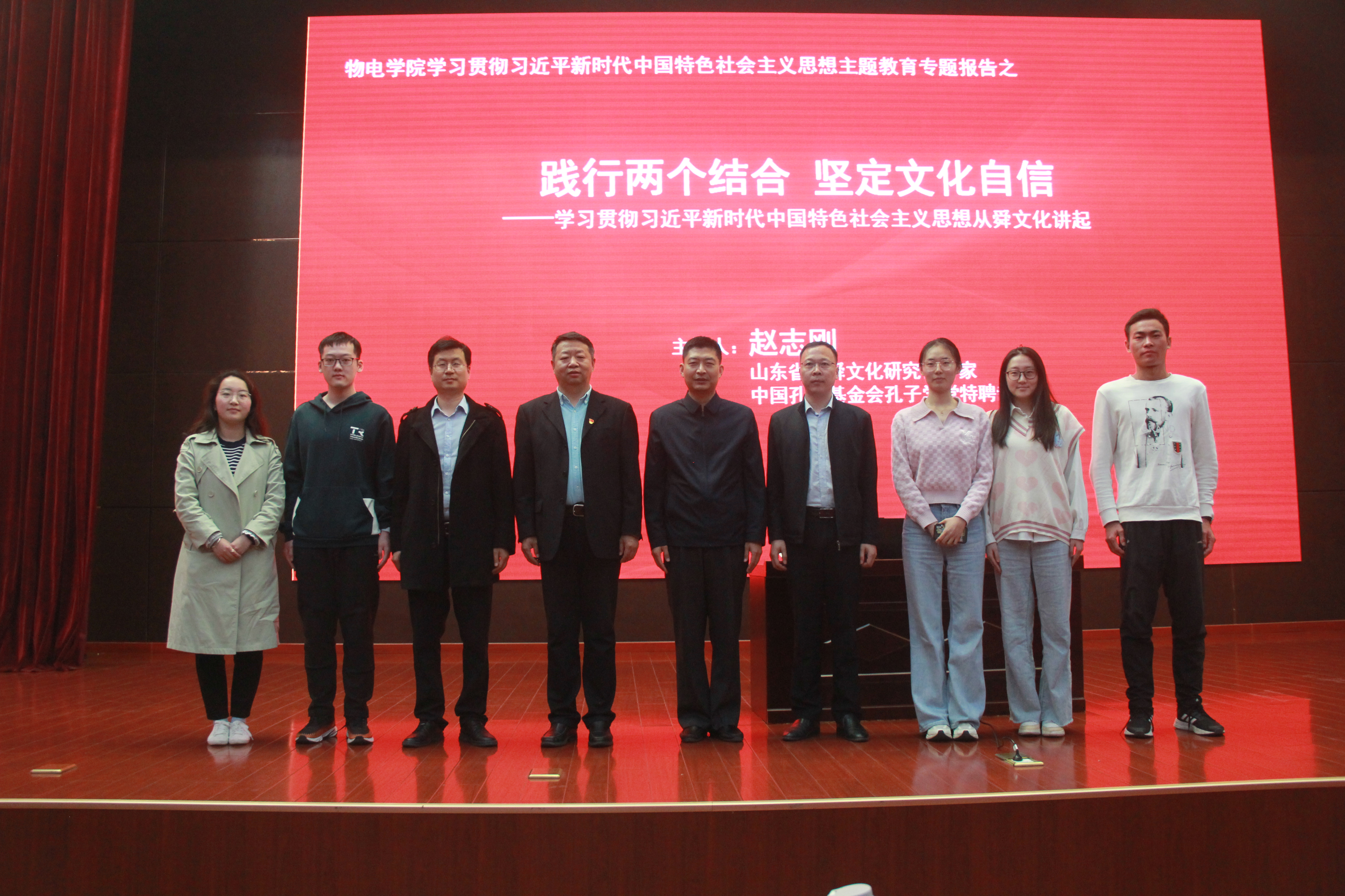 4月27日下午,学院在树蕙堂举行“践行两个结合,坚定文化自信——学习贯彻习近平新时代中国特色社会主义思想从舜文化讲起”主题教育专题报告,山东省大舜文化研究会副秘书长、中国孔子基金会孔子学堂特聘专家赵志刚担任主讲,学院党委书记谢德仁主持报告会。副院长任俊峰、宋玉志及学院师生党员、入党积极分子参会学习。赵志刚围绕舜文化的兴起与发展进行讲述。从舜城济南的文化概况,到舜的传奇一生,赵志刚用简洁生动的语言将中国特色社会主义文化和城市人文发展联系在一起,...