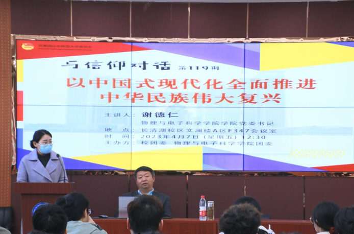 4月7日中午,物理与电子科学学院于文澜楼A区F347开展第119期题为“以中国式现代化全面推进中华民族伟大复兴”与信仰对话主题讲座,本次讲座由学院党委书记谢德仁担任主讲人,22级辅导员姚方圆、学院第66期党基班百余人参加本次会议。谢德仁围绕“中国式现代化不是西方化”、“中国式现代化理论体系”、“全面建设社会主义现代化国家的战略部署”三方面展开阐述。结合习近平总书记在党的二十大重要讲话,他指出了现阶段党的战略定位、...