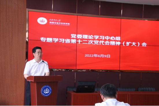 6月9日中午,物电学院在长清湖校区文澜楼A座F347召开党委理论学习中心组学习(扩大)会,专题传达学习中国共产党山东省第十二次代表大会精神,并研究部署贯彻落实工作。副校长王传奎作省第十二次党代会辅导报告,党委理论学习中心组成员蔡阳健、杜伟、赵曰峰、宋玉志、周勇参加学习会,学院各支部支委会成员列席会议。会议由学院党委书记谢德仁主持。谢德仁简要介绍了省第十二次党代会基本情况,认真传达了省党代会主要会议精神...
