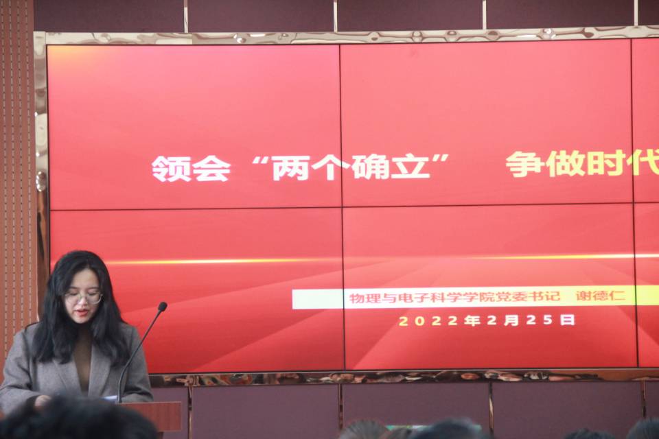 为引导青年学子深入学习贯彻党的十九届六中全会精神,确保新学期思政工作顺利开展,2月25号中午,物理与电子科学学院于文澜楼A区f347会议室举办“与信仰对话”之“领会两个确立,争做时代新人”开学第一课。学院党委书记谢德仁担任本次活动主讲人,学生会干部、部分研究生学生及团校学员百余人与会,活动由18级辅导员方芳主持。谢德仁立足于十九届六中全会审议通过的《中共中央关于党的百年奋斗重大成就和历史经验的决议》,从...