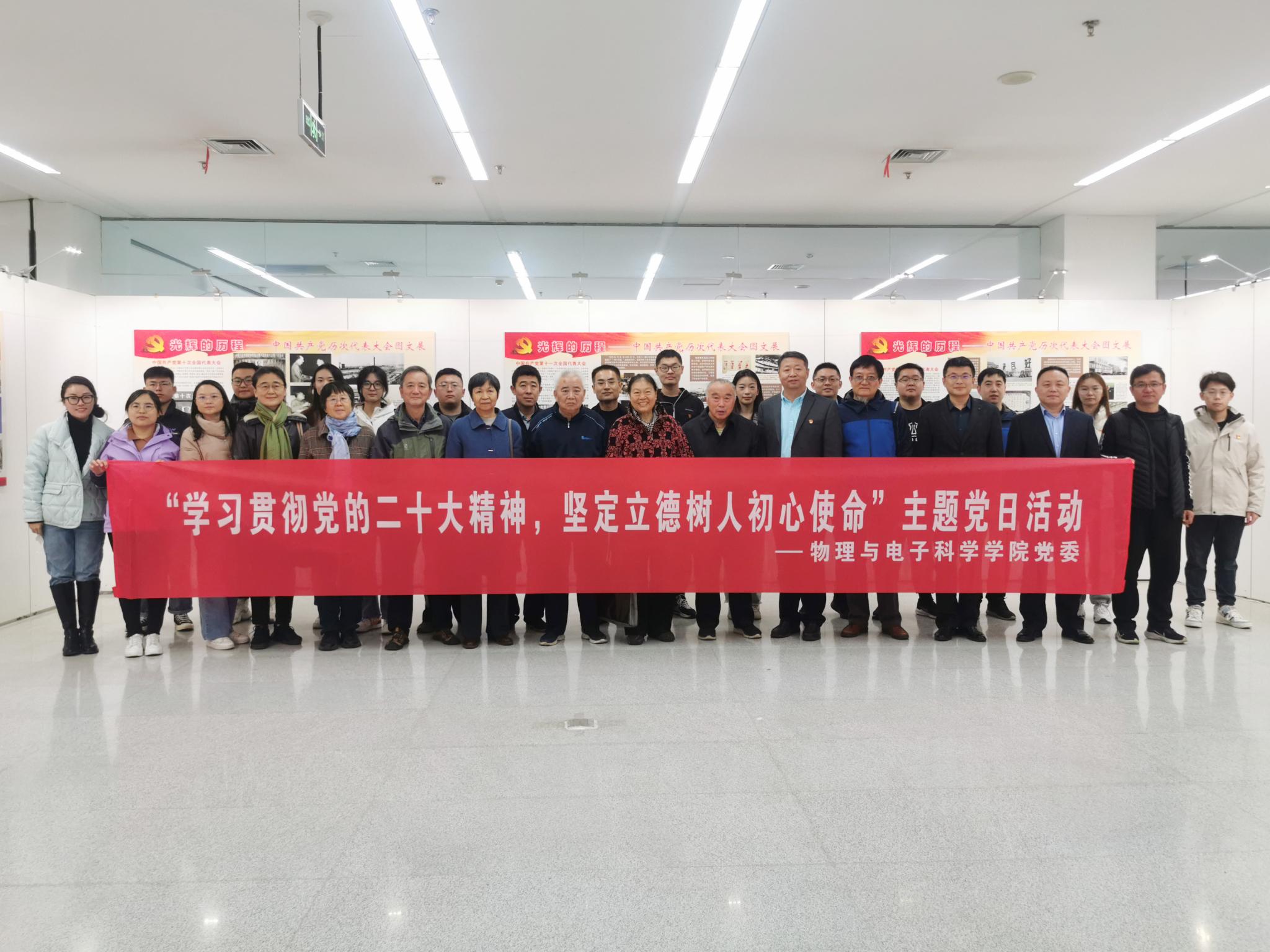 11月3日上午,物理与电子科学学院党委开展“学习贯彻党的二十大精神,坚定立德树人初心使命”主题党日活动。学院党委书记谢德仁,党委副书记杜伟出席活动,物电学院专职组织员、党支部成员、退休教工党员及党外人士代表参加本次活动。上午十点,参加主题党日活动党员师生来到长清湖校区图书馆,在讲解员的引导下观看“中国共产党历次代表大会馆藏红色文献图文展”和“中共山东百年历史图片展”,回顾党的百年历史,重温党的光辉...
