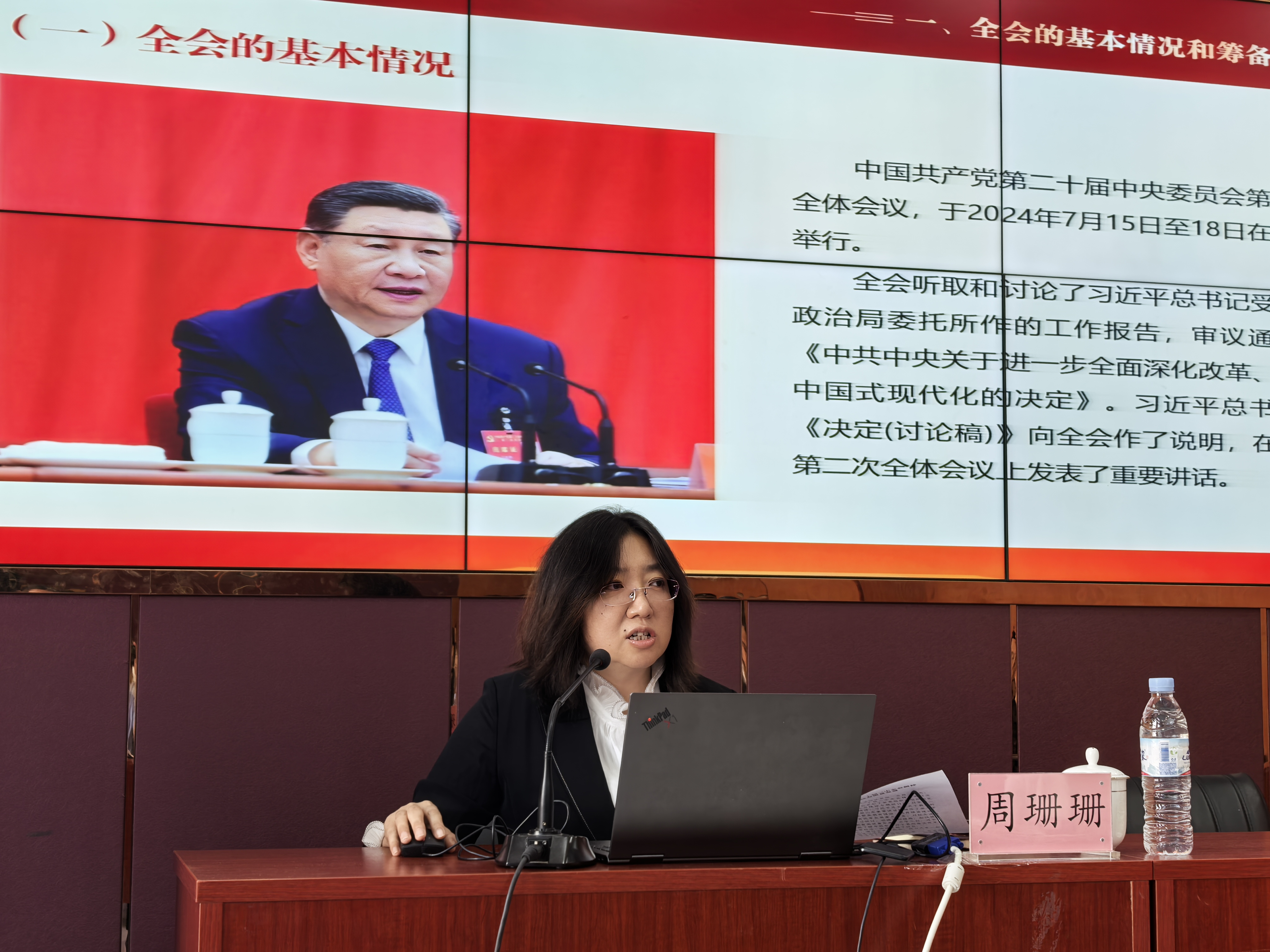 9月25日上午,为深入学习和贯彻党的二十届三中全会精神,增强学院全体党员对全会内容的理解与认知,物电学院举办学习贯彻党的二十届三中全会精神宣讲会。校党委常委、副校长周珊珊应邀出席并作专题报告。学院领导班子、各党支部书记及80余名党员师生代表参加了此次报告会。报告会由学院党委书记谢德仁主持。报告会上,周珊珊围绕全会基本情况和筹备过程、深入学习领会习近平总书记在全会上的重要讲话精神、全面准确理解《决定》提出的进一步全面深化改革重大举措、...