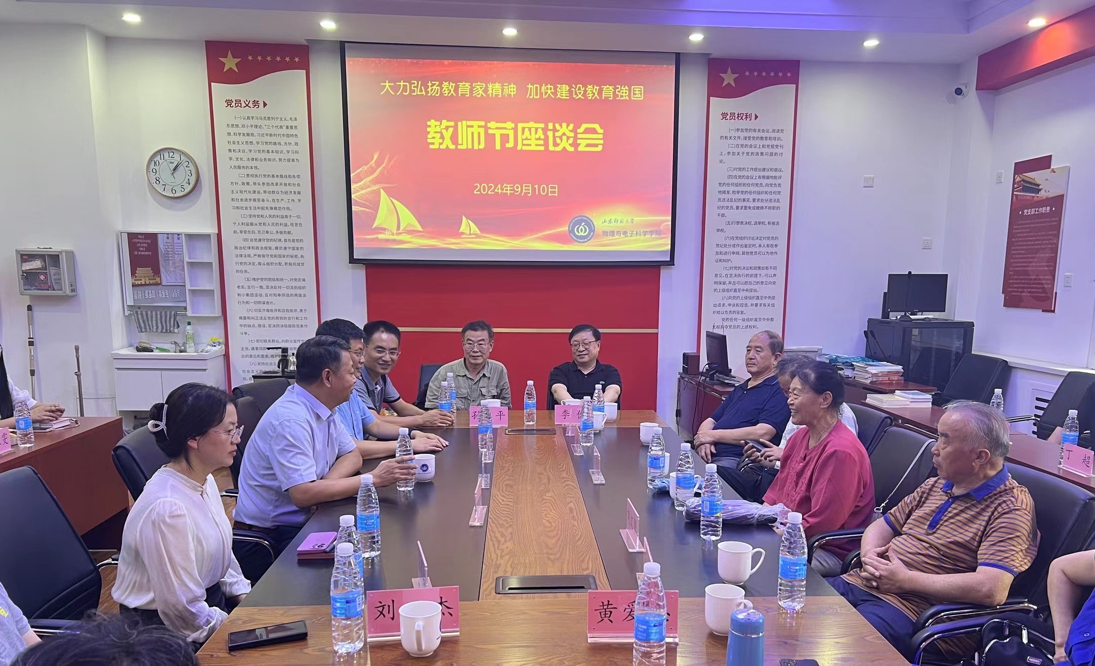 为庆祝第40个教师节,大力弘扬教育家精神,营造尊师重教浓厚氛围,9月10日下午,物理与电子科学学院于文澜楼F311举行教师节座谈会,院党委书记谢德仁,副书记杜伟,副院长宋玉志、王晶晶,物理系主任胡贵超,电子系主任宋蓬勃,团委书记方芳,退休教师陈秀兰、刘文贤、黄爱忠、高铁军、李玲、李健、张春光、孙平、刘杰,以及2024年新入职教师参加座谈会。座谈会上,围绕“大力弘扬教育家精神、加快建设教育强国”的教师节主题,师德师风建设,...