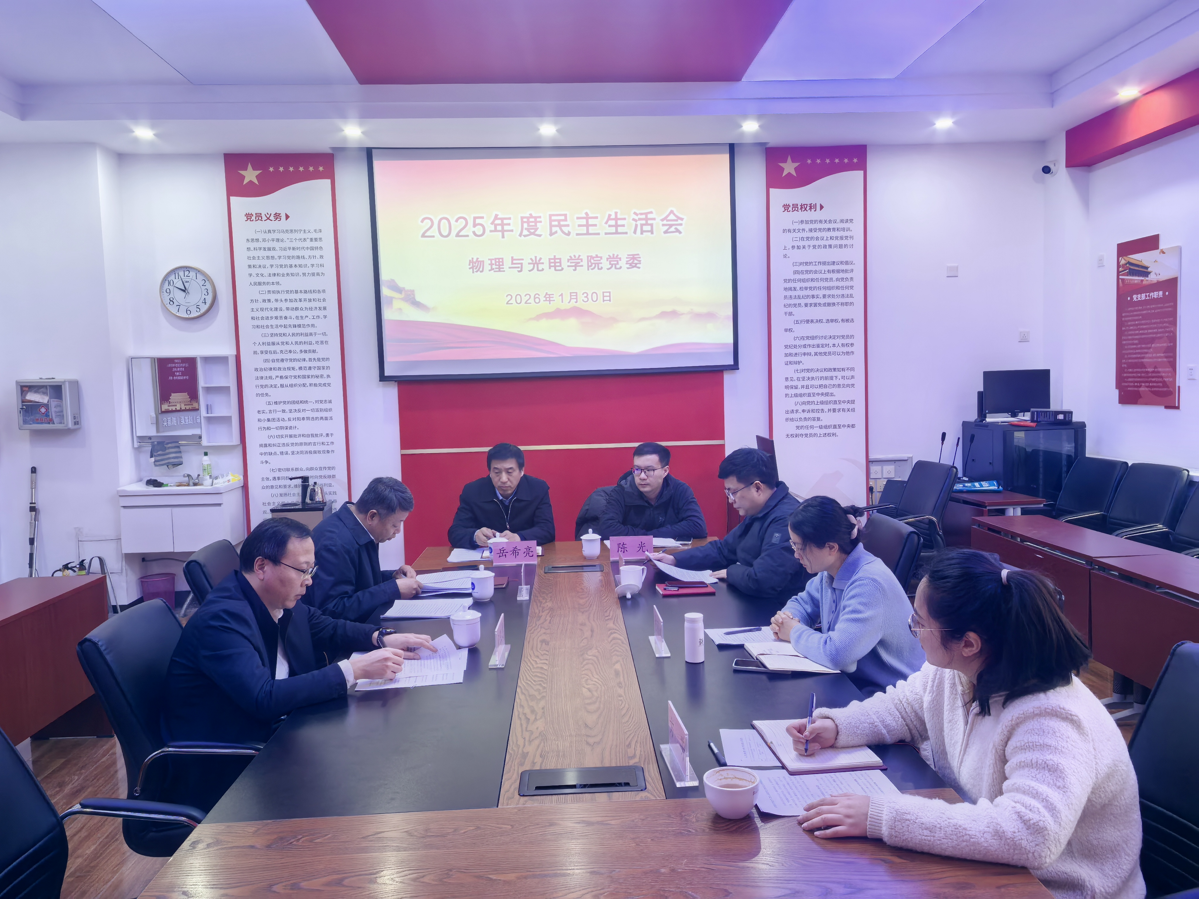 1月30日,物理与光电学院党委按照学校党委统一部署,组织召开民主生活会。学校督导组岳希亮、陈光到会指导。学院党委书记谢德仁主持会议,学院党政领导班子及全体党委委员参加会议,党政办公室有关同志列席会议。会议首先通报了上一年度民主生活会整改措施落实情况和本次民主生活会征求意见情况。谢德仁代表学院领导班子作对照检查,重点围绕五个方面,坚持“三个务必”、意识形态工作、加强作风建设、激励担当作为等工作情况,一并纳入民主生活会对照检查的内容。...
