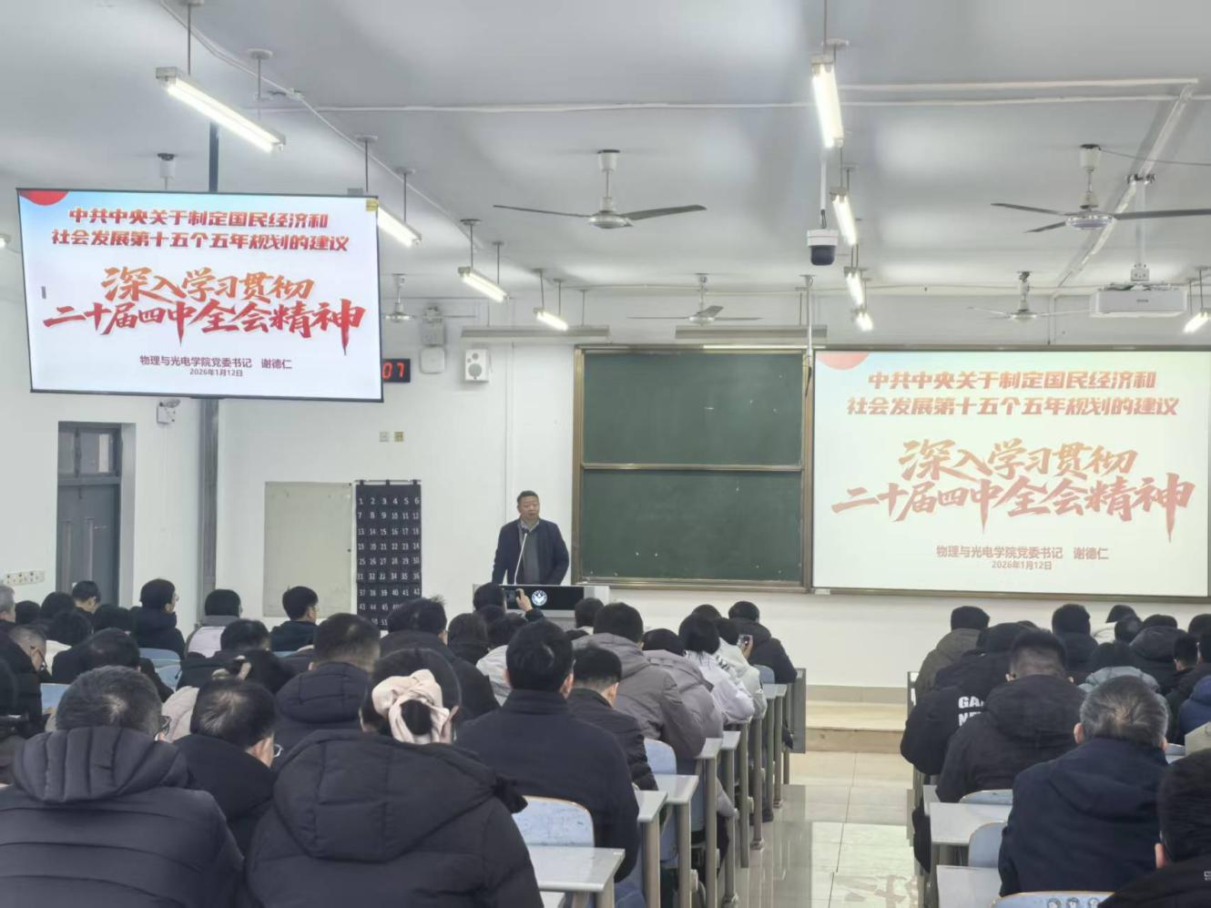 为全面且精准地把握党的二十届四中全会的核心要旨与精神实质,切实将全院师生的思想与行动统一到党中央的决策部署上来,1月12日,物理与光电学院党委精心举办了“深入学习贯彻党的二十届四中全会精神”专题辅导报告会。学院党委书记谢德仁以《深入学习贯彻党的二十届四中全会精神,奋力开创学院高质量发展新局面》为主题作辅导报告。学院全体教职员工参与学习。报告会上,谢德仁系统且全面地梳理了党的二十届四中全会的重大历史意义与深远战略考量。...