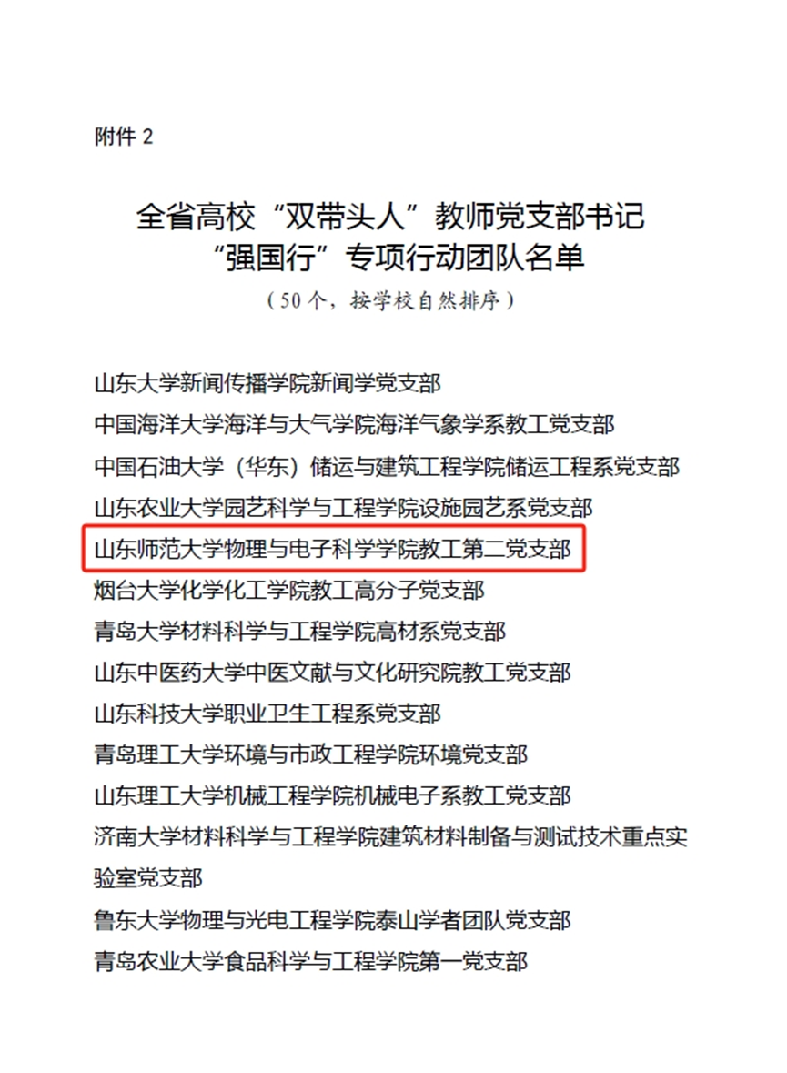近日,中共山东省委教育工委公布了全国和全省高校“双带头人”教师党支部书记“强国行”专项行动团队名单,物理与电子科学学院教工第二党支部入选全省高校“双带头人”教师党支部书记“强国行”专项行动团队。今年7月以来,教育部办公厅、省委教育工委组织开展高校“双带头人”教师党支部书记“强国行”专项行动,经各高校党委推荐申报、省委教育工委组织专家评审,来自全省86所高校的72个党支部入选国家级团队、50个党支部入选省级团队。...
