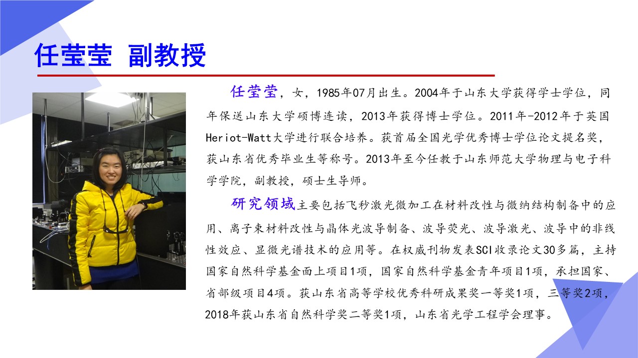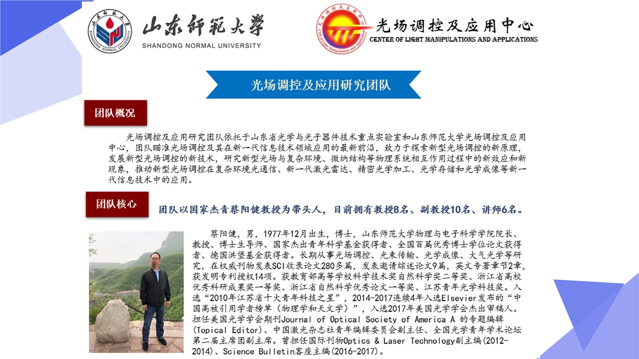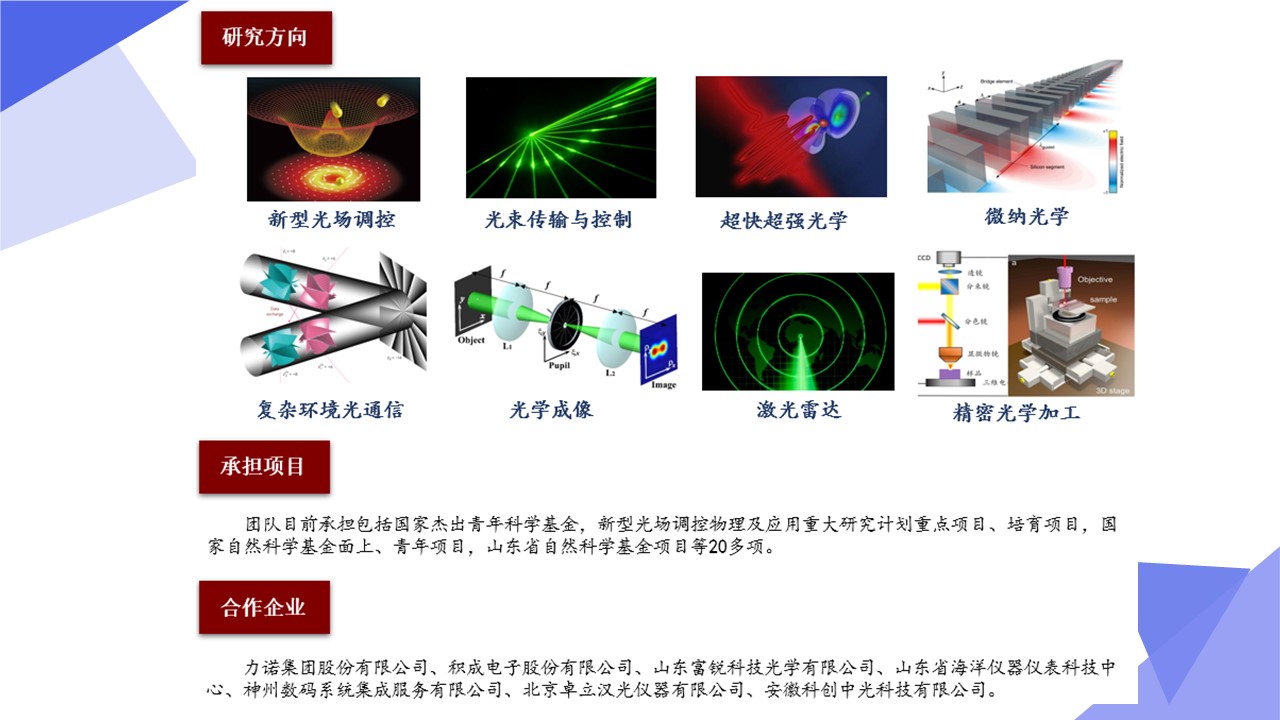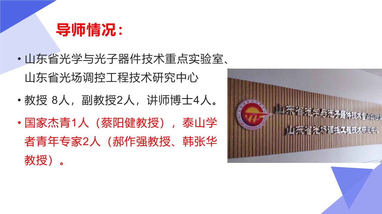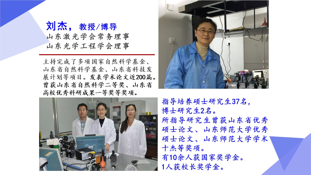 光学工程一级学科硕士点依托山东师范大学物理与电子科学学院建设,目前已经形成了一支结构合理、团结合作、学术思想端正、学术气氛活跃的学术队伍,拥有国家杰青1人,泰山学者3人,省突贡专家2人,省杰青1人,省优青1人,拥有物理学一级学科博士点和博士后流动站;“光学与光子器件实验室”和“医学物理图像处理技术”省级重点实验室、“光电功能材料与器件实验室”省“十三五”高校重点实验室。实验设备总值为5000余万元,实验室面积9000余平方米。近三年来,共主持国家级项目37项,其中重大计划(培育)项目1项,获国家级“新工科”教改项目1项,省部级项目23项;在国内外学术期刊上发表论文391篇,获发明授权专利30项;获国家自然科学二等奖1项、教育部高校科学研究优秀成果自然科学二等奖1项、省自然科学二等奖3项、省科学技术进步奖一等奖1项,省国际科学技术合作奖1项。