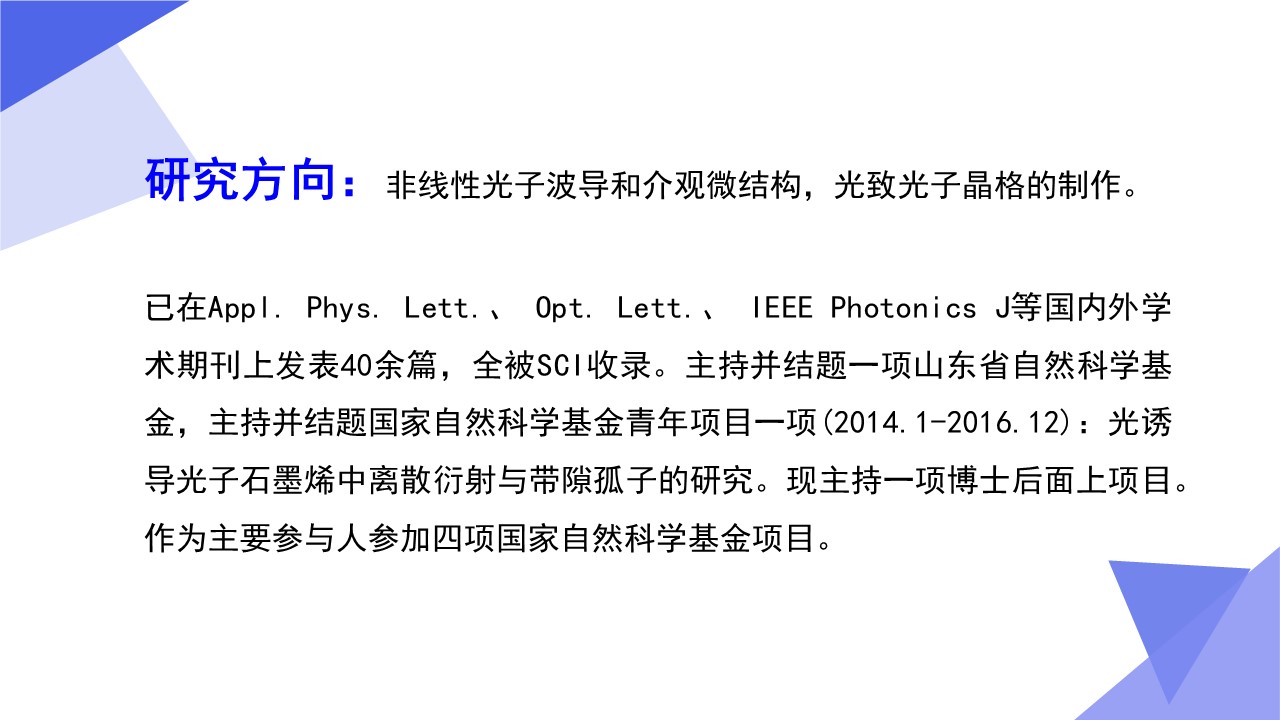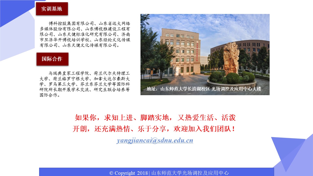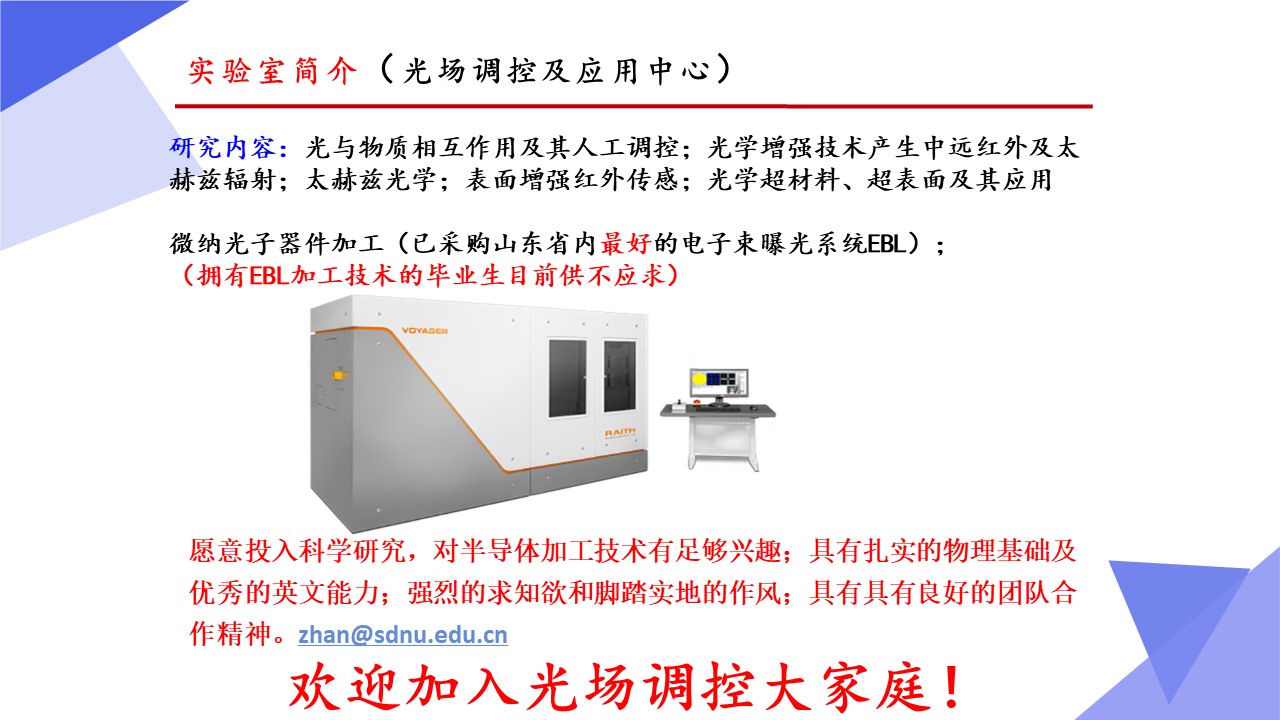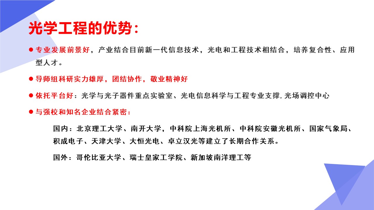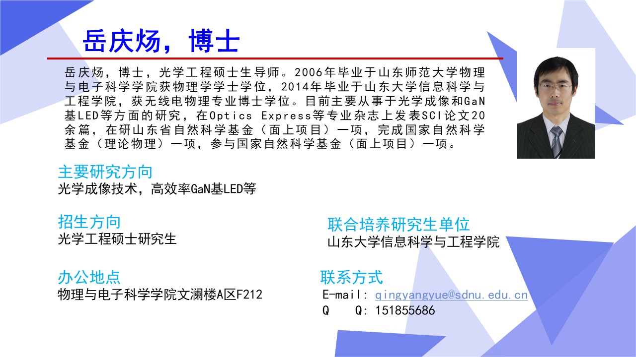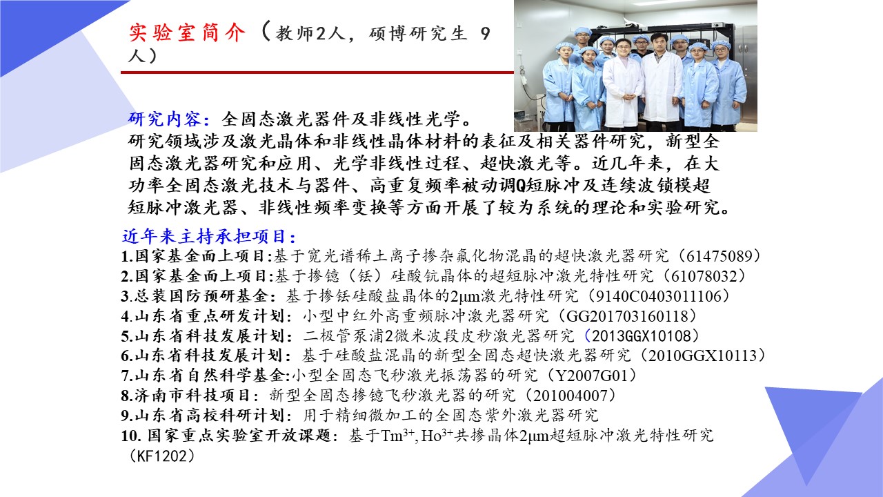 光学工程一级学科硕士点依托山东师范大学物理与电子科学学院建设,目前已经形成了一支结构合理、团结合作、学术思想端正、学术气氛活跃的学术队伍,拥有国家杰青1人,泰山学者3人,省突贡专家2人,省杰青1人,省优青1人,拥有物理学一级学科博士点和博士后流动站;“光学与光子器件实验室”和“医学物理图像处理技术”省级重点实验室、“光电功能材料与器件实验室”省“十三五”高校重点实验室。实验设备总值为5000余万元,实验室面积9000余平方米。近三年来,共主持国家级项目37项,其中重大计划(培育)项目1项,获国家级“新工科”教改项目1项,省部级项目23项;在国内外学术期刊上发表论文391篇,获发明授权专利30项;获国家自然科学二等奖1项、教育部高校科学研究优秀成果自然科学二等奖1项、省自然科学二等奖3项、省科学技术进步奖一等奖1项,省国际科学技术合作奖1项。