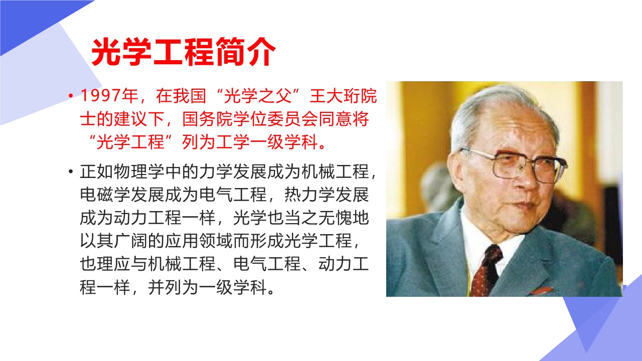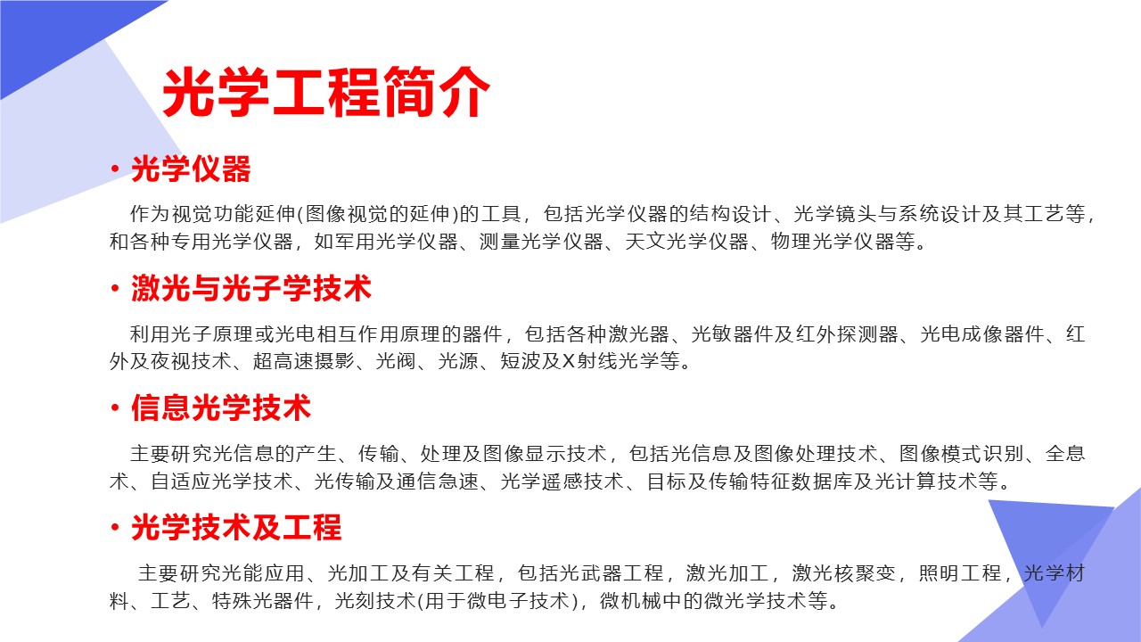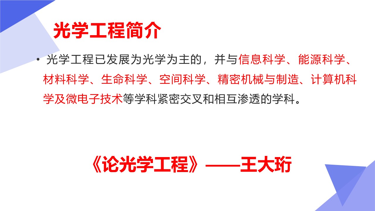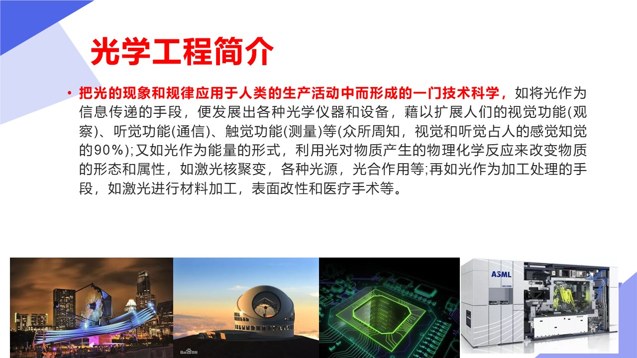 光学工程学科以光学技术为主要手段,研究以光为信息传递媒介的信息科学与技术领域的基本问题,主要包括光场产生、调控与变换、光与物质相互作用、新型光电功能材料与器件,以及光电检测与系统设计等研究方向。光学工程学科与电子科学与技术、精密机械与制造、计算机科学与技术等学科相互交叉渗透,日益成为现代信息科学与技术的基础。