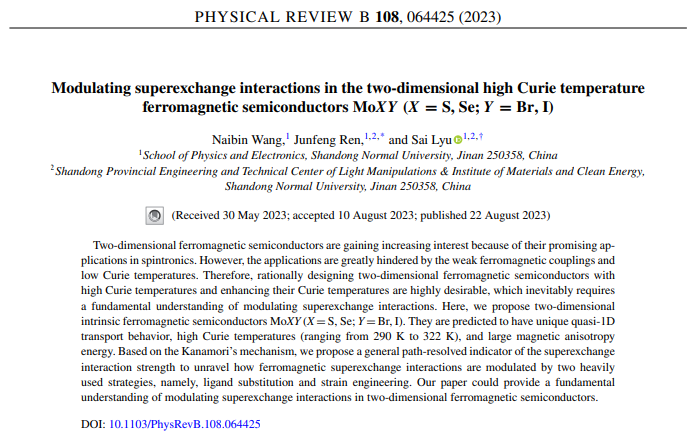 近日,任俊峰教授团队吕赛博士在凝聚态物理领域国际顶级期刊《Physical Review B》上发表了题为“Modulating superexchange interactions in the two-dimensional high Curie temperature ferromagnetic semiconductors MoXY (X = S, Se; Y = Br, I)”的学术论文。山东师范大学是论文唯一完成单位,王乃斌硕士研究生为第一作者,任俊峰教授和吕赛博士为通讯作者。