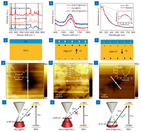 表面增强拉曼光谱(SERS)在食品安全、环境保护和生物成像等领域有着广泛的应用前景,但是基于化学机制的SERS基底通常面临普适性差,调控困难且不可逆等挑战,限制了其在实际检测中的应用。针对以上问题,作者提出了一种基于铁电效应调控SERS化学增强的新策略,通过控制铁电材料的极化方向和极化强度,可以灵活、可逆地控制表面吸附氧化石墨烯的费米能级,从而优化基底与靶分子之间的电荷转移跃迁,实现了在同一基底上对不同能带结构分子的超灵敏普适性检测。该研究为基于化学增强机制的SERS基底的制备和应用提供了新思路,并有望将其拓展到其他低维材料。