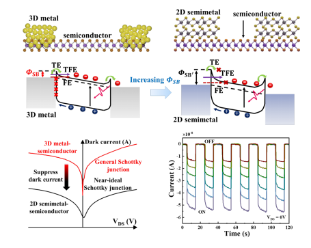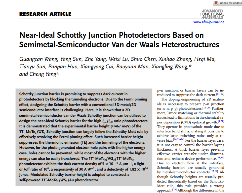 近日,山东师范大学物电学院杨诚教授课题组提出了一种增加肖特基势垒高度来抑制暗电流、提高开关比的策略,并制备了高性能的光电探测器,相关成果以“Near-Ideal Schottky Junction Photodetectors Based on Semimetal-Semiconductor Van der Waals Heterostructures”为题发表在物理学自然指数期刊《Advanced Functional Materials》(IF = 19)上。山东师范大学为第一署名单位,2019级硕士生王广灿为第一作者,杨诚教授和山东大学王响玲教授为论文通讯作者。