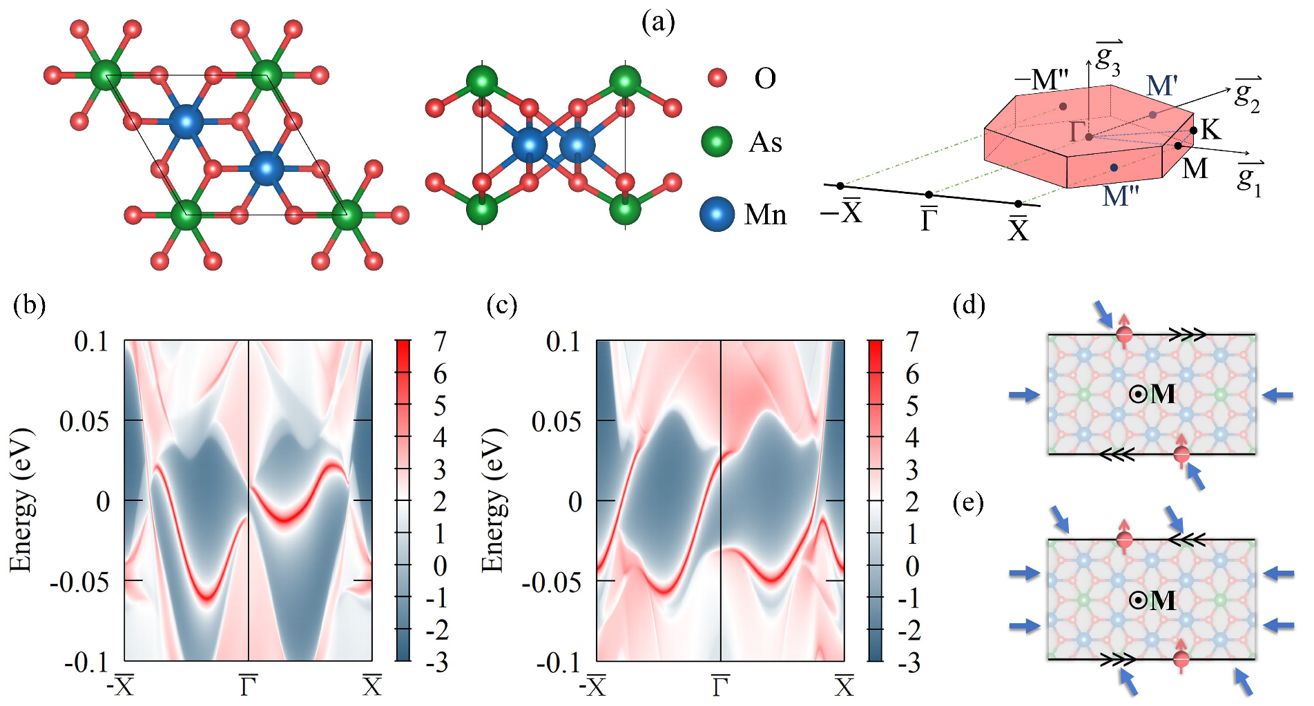 图1. (a)单层MnAsO3的晶格结构与布里渊区示意图。体系分别在-1%和-6%的压缩应变下的无耗散边缘态图(b) (c)和相应的QAHE示意图(d) (e)。