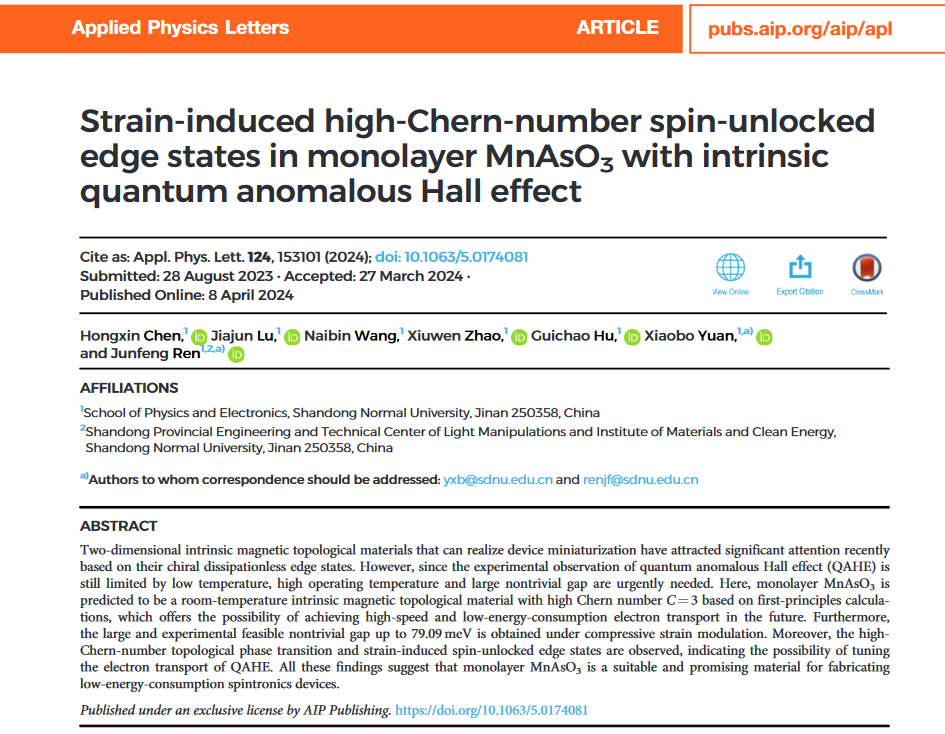 近日,任俊峰教授团队在应用物理领域国际知名期刊《Applied Physics Letters》上发表了题为“Strain-induced high-Chern-number spin-unlocked edge states in monolayer MnAsO3 with intrinsic quantum anomalous Hall effect”的学术论文。山东师范大学为唯一论文署名单位,博士研究生陈洪欣为第一作者,原晓波副教授和任俊峰教授为通讯作者。