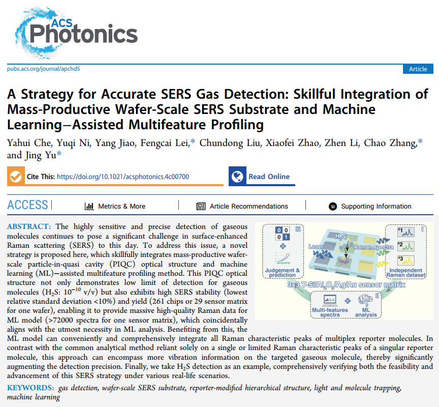 近日,满宝元教授团队在知名光学期刊《ACS Photonics》上发表题为“A Strategy for Accurate SERS Gas Detection: Skillful Integration of Mass-Productive Wafer-Scale SERS Substrate and Machine Learning-Assisted Multi-Features Profiling”的学术论文。山东师范大学物电学院为论文第一署名单位,硕士生车亚辉为论文第一作者,郁菁副教授、张超教授为论文通讯作者,该论文完成过程中得到我院焦扬副教授、李振副教授、赵晓菲博士的帮助与支持。