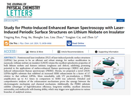 近日,山东师范大学蔡阳健教授团队与满宝元教授团队合作在国际知名期刊《Applied Physics Letters》和《The Journal of Physical Chemistry Letters》上分别发表题为“Laser-induced periodic surface structures on Fe-ion doped LN crystal for pyroelectric SERS analysis.”和“Study for Photo-Induced Enhanced Raman Spectroscopy with Laser-Induced Periodic Surface Structures on Lithium Niobate on Insulator”的研究论文。其中,发表在JPCL期刊的论文入选当期封面论文。两篇论文山东师范大学均为第一署名单位,论文第一作者为任莹莹教授,通讯作者为山东师范大学赵丽娜教授和李振副教授。