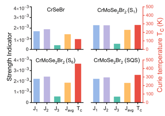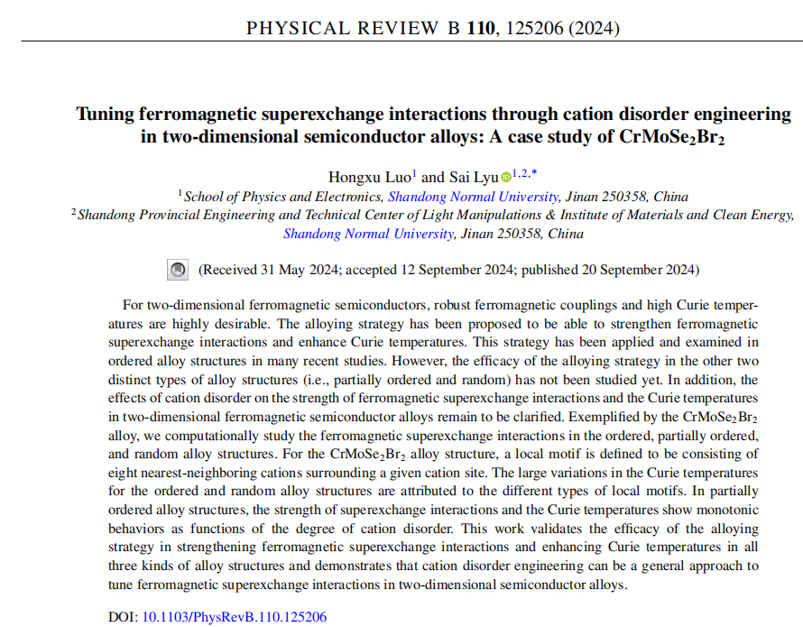 近日,任俊峰教授团队吕赛副教授课题组在凝聚态物理领域期刊《Physical Review B》上发表了题为“Tuning ferromagnetic superexchange interactions through cation disorder engineering in two-dimensional semiconductor alloys: A case study of CrMoSe2Br2”的学术论文。山东师范大学为论文唯一署名单位,课题组硕士研究生罗宏旭为第一作者,通讯作者为吕赛副教授。