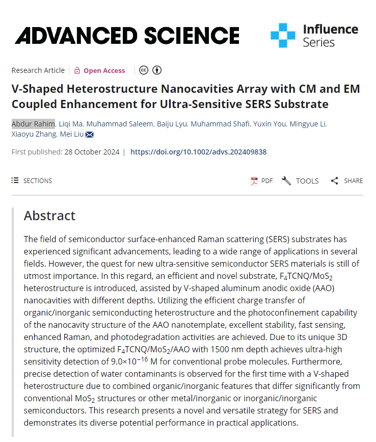 近日,满宝元教授团队,刘玫教授课题组在先进科学领域期刊《Advanced Science》上发表了题为“V-Shaped Heterostructure Nanocavities Array with CM and EM Coupled Enhancement for Ultra-Sensitive SERS Substrate”的研究成果。山东师范大学为论文唯一署名单位,课题组2021级巴基斯坦籍博士生Abdur Rahim为第一作者,通讯作者为刘玫教授。