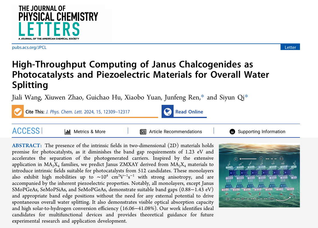 近日,山东师范大学物理与电子科学学院任俊峰教授团队在自然指数期刊《The Journal of Physical Chemistry Letters》上发表了题为“High-Throughput Computing of Janus Chalcogenides as Photocatalysts and Piezoelectric Materials for Overall Water Splitting”的学术论文。山东师范大学为唯一论文署名单位,博士研究生王佳丽为第一作者,任俊峰教授和齐思云讲师为通讯作者。