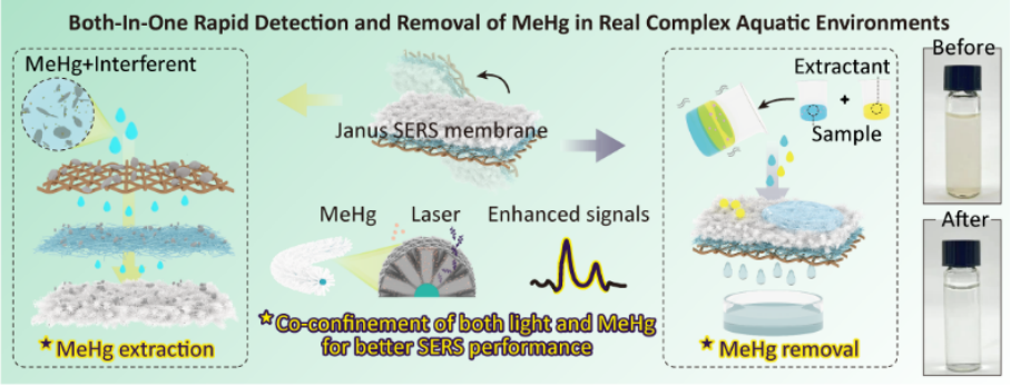 甲基汞(MeHg)是水体重金属污染的罪魁祸首之一,相比于无机汞,其更容易穿透生物膜,在组织或器官中形成积累,且不易代谢,因此展现出很强的生物毒性。表面增强拉曼散射(SERS)技术具有很强的特异性和时效性,在MeHg检测领域展现出较大的潜力,而基于SERS技术的MeHg检测面临的最大挑战之一是如何在复杂环境中对痕量MeHg进行快速且精准的识别。此外,精准检测MeHg的最终目的是为了对水中含量超标的MeHg及时进行干预。然而,由于环境中缺乏MeHg的自然清除机制,因此如何对水中的MeHg进行人工快速去除同样具有重要的意义。