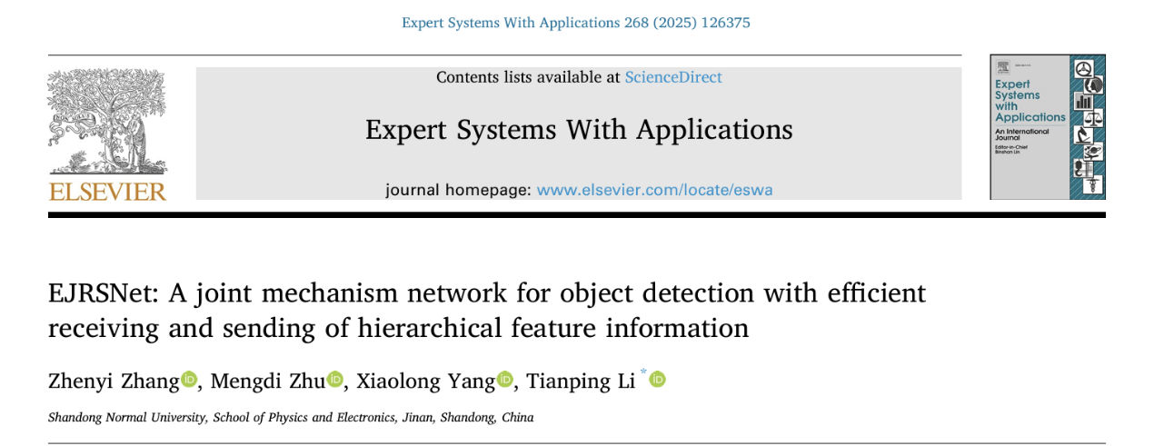 近日,学院李天平教授课题组在人工智能领域TOP期刊《Expert Systems with Applications》上发表题为“EJRSNet: A Joint Mechanism Network for Object Detection with Efficient Receiving and Sending of Hierarchical Feature Information”的研究论文。山东师范大学为唯一完成单位,硕士研究生张振亦为第一作者,李天平教授为通讯作者。