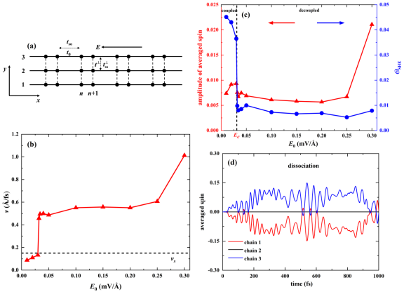 图1. (a) 三条耦合有机链结构图;(b) 极化子饱和速度随电场变化;(c) SHE幅度和转换效率的场依赖性;(d) 极化子解离后的SHE含时演化。