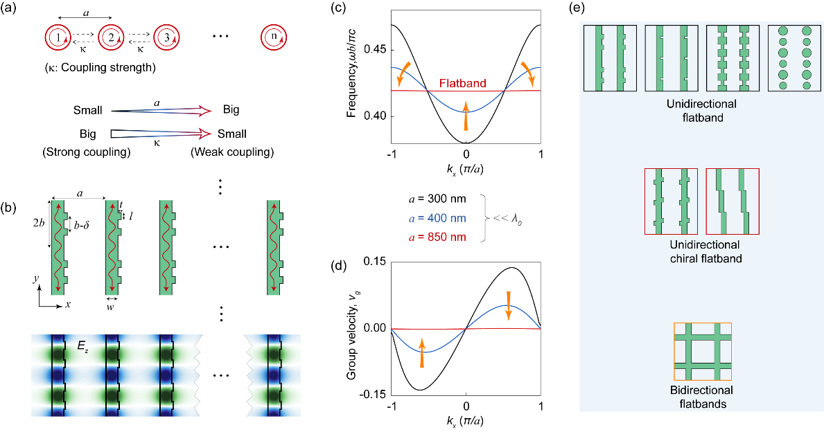 在这项研究中,他们将耦合谐振腔光波导(CROW)的物理特性扩展到非局域超表面中,从而在远场光谱中实现了广角光子平带行为。所设计的超表面由弱耦合的光波导阵列组成,并通过周期性破坏平移对称性或进一步操控面内对称性,使这些结构能够实现多种偏振选择性响应。将CROW与超表面结合的显著成果在于,它为广角光子平带和手性平带的设计提供了宝贵的理论依据,通过数值模拟和实验验证,研究展示了多个示例,突出了如何利用这种CROW启发的超表面实现单向和双向线偏振光子平带,尤其展示了对入射光圆偏振的高度选择性手性平带。因此,这项工作代表了非局域超表面工程的一个重要转折点,为光与物质相互作用的进一步研究开辟了新的方向。