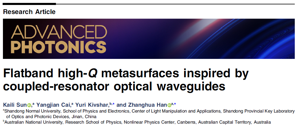 近日,蔡阳健教授/韩张华教授团队在国际光学顶级期刊《Advanced Photonics》上发表了题为“Flatband high-Q metasurfaces inspired by coupled-resonator optical waveguides”的研究论文。山东师范大学为第一完成单位,物电学院博士生孙开礼为论文第一作者,韩张华教授为通讯作者,共同通讯作者还包括澳大利亚国立大学的Yuri Kivshar院士。蔡阳健教授也为该工作做出了重要贡献。