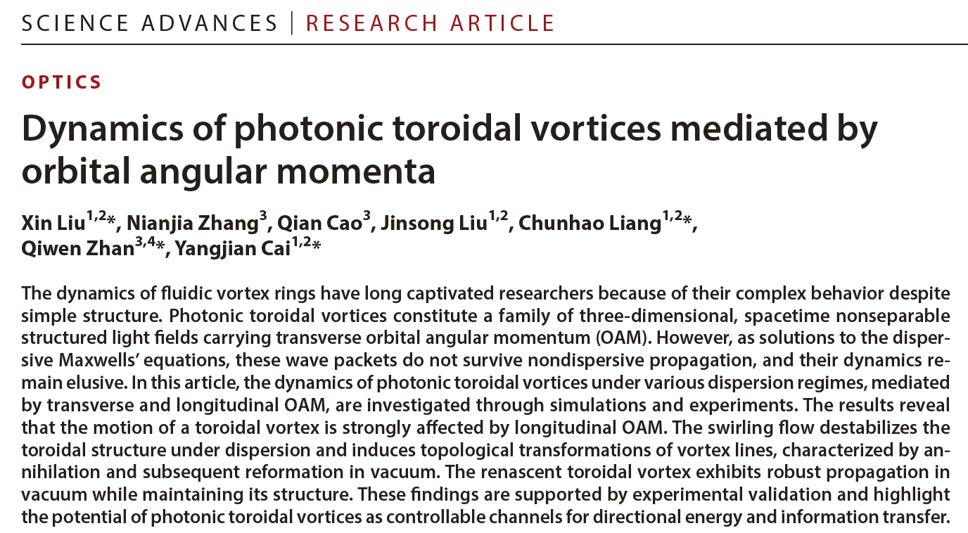 近日,山东师范大学物理与电子科学学院光场调控及应用中心蔡阳健教授团队在国际顶级期刊《Science Advances》上发表题为“Dynamics of photonic toroidal vortices mediated by orbital angular momenta”的研究论文。山东师范大学为第一完成单位,物理与电子科学学院青年教师刘欣为论文第一作者,蔡阳健教授为通讯作者,共同通讯作者还包括物电学院梁春豪教授和上海理工大学詹其文教授。
