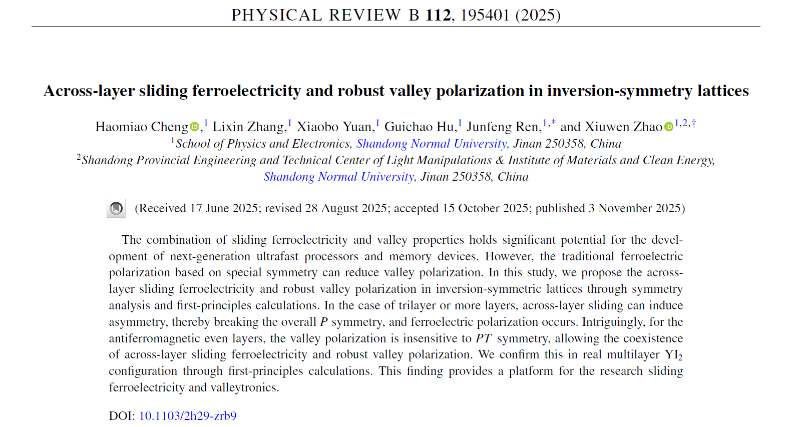 近日,学院任俊峰教授团队在自然指数期刊《Physical Review B》上发表了题为“Across-layer sliding ferroelectricity and robust valley polarization in inversion-symmetry lattices”的研究论文。山东师范大学为唯一署名单位,硕士研究生程昊淼为第一作者,任俊峰教授和青年教师赵秀雯为论文通讯作者。