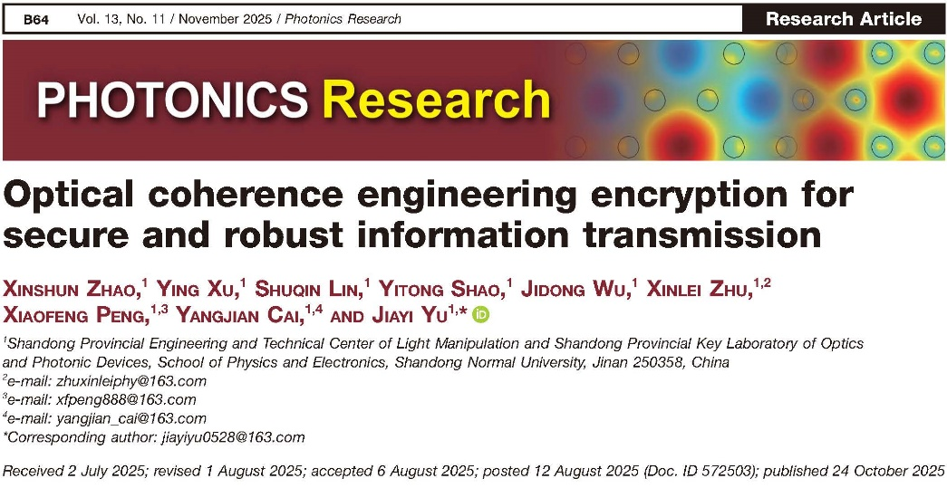 近日,山东师范大学蔡阳健教授团队在国际期刊《Photonics Research》(影响因子7.2)上发表题“Optical coherence engineering encryption for secure and robust information transmission”的研究论文。本研究将信息通过光场相干结构调控实现高安全加密,并同时实现加密信息的鲁棒传输和精确恢复。山东师范大学博士生赵欣顺为论文的第一作者、朱新蕾副教授、彭啸峰讲师、蔡阳健教授和余佳益副教授为论文共同通讯作者。