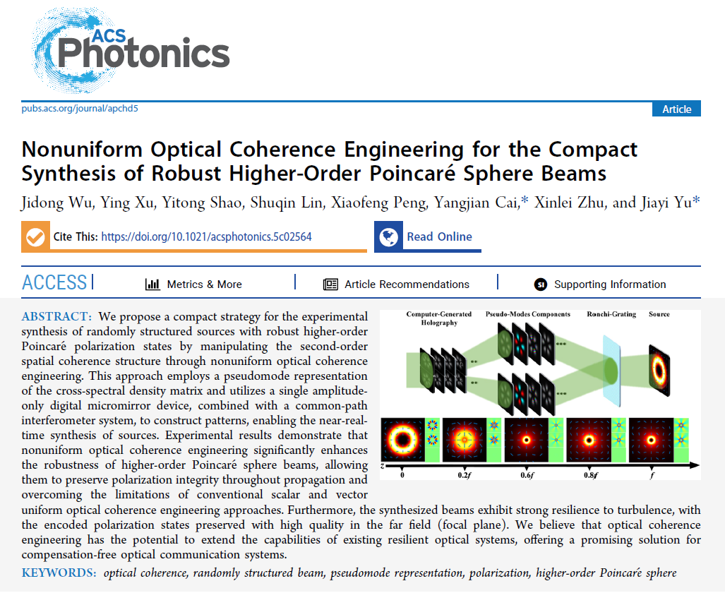 近日,山东师范大学蔡阳健教授团队在国际著名期刊《ACS Photonics》(影响因子6.7)上发表题“Nonuniform Optical Coherence Engineering for the Compact Synthesis of Robust Higher-Order PoincaréSphere Beams”的研究论文。山东师范大学博士生吴继栋为论文的第一作者;蔡阳健教授和余佳益副教授为论文共同通讯作者。
