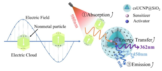 上转换发光材料在生物成像、太阳能电池和光学安全等领域展现出巨大的应用潜力。然而,其发光效率受到稀土离子固有的低吸收截面和非辐射能量损失的限制。该研究通过表面钝化和等离激元效应增强了核壳纳米粒子的上转换发光性能。在掺杂高Tm3+浓度(10%)条件下,该体系实现了最高的荧光强度,突破了传统具有大晶格参数体系中低掺杂浓度的限制。采用双钙钛矿壳层与SiO2包覆的双重策略提高了稳定性和效率,半导体等离激元则使发光强度增加了两倍。该研究进一步展示了该材料在多色防伪中的先进加密能力以及在生物检测中细胞成像方面的广阔应用前景。