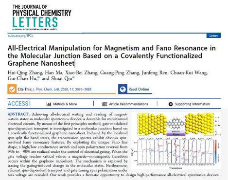 近日,山东师范大学物理与光电学院胡贵超教授课题组在自然指数期刊《The Journal of Physical Chemistry Letters》上发表题为“All-Electrical Manipulation for Magnetism and Fano Resonance in the Molecular Junction Based on a Covalently Functionalized Graphene Nanosheet”的学术论文。山东师范大学为唯一论文署名单位,博士研究生张惠晴为第一作者,胡贵超教授和邱帅副教授为通讯作者。