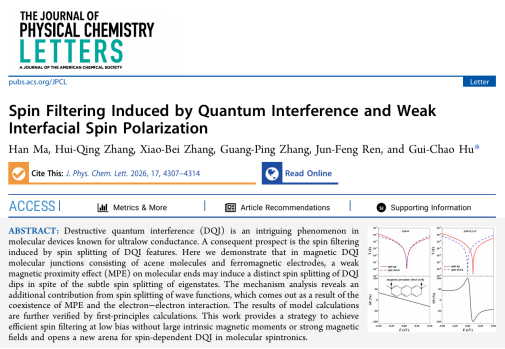 近日,山东师范大学物理与光电学院胡贵超教授课题组在自然指数期刊《The Journal of Physical Chemistry Letters》上发表题为“Spin Filtering Induced by Quantum Interference and Weak Interfacial Spin Polarization”的学术论文。山东师范大学为唯一论文署名单位,博士研究生马晗为第一作者,胡贵超教授为通讯作者。