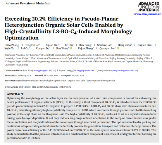 近日,山东师范大学物理与光电学院满宝元教授团队在自然指数期刊《Advanced Functional Materials》(影响因子18.2)上发表题为“Exceeding 20.2%Efficiency in Pseudo-Planar Heterojunction Organic Solar Cells Enabled by High-Crystallinity L8-BO-C4-Induced Morphology Optimization”的研究论文。山东师范大学为第一署名单位,山东师范大学张超教授为第一作者、硕士研究生韩腾飞为第二作者,王健教授、张福俊教授、孙倩倩副教授为论文共同通讯作者。