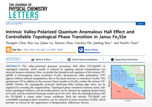 近日,我院任俊峰教授团队在国际著名期刊《The Journal of Physical Chemistry Letters》上发表了题为“Intrinsic Valley-Polarized Quantum Anomalous Hall Effect and Controllable Topological Phase Transition in Janus Fe2SSe“的学术论文。山东师范大学是唯一完成单位,硕士研究生陈洪欣为第一作者,任俊峰教授和原晓波副教授为通讯作者。