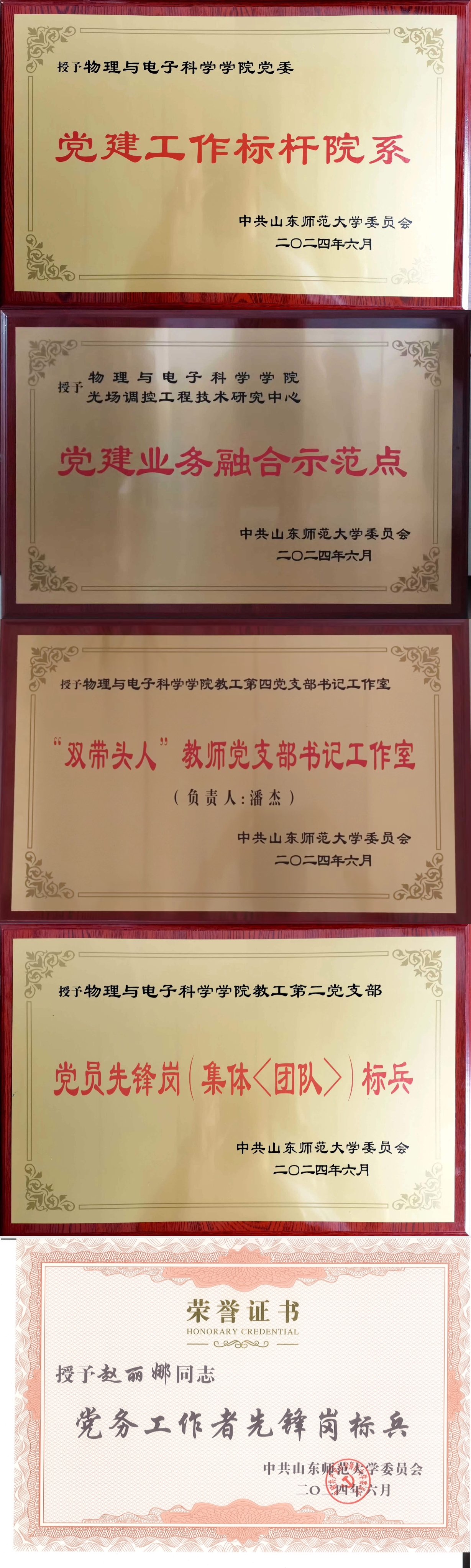 在本次表彰中,物理与电子科学学院荣获多项荣誉。学院党委获评首批党建工作标杆院系,学院教工第四党支部获评第二批“双带头人”教师党支部书记工作室,学院光场调控工程技术研究中心获评首批党建业务融合示范点,学院教工第二党支部获评第二批党员先锋岗(集体〈团队〉)标兵,赵丽娜获评第二批党务工作者先锋岗标兵。