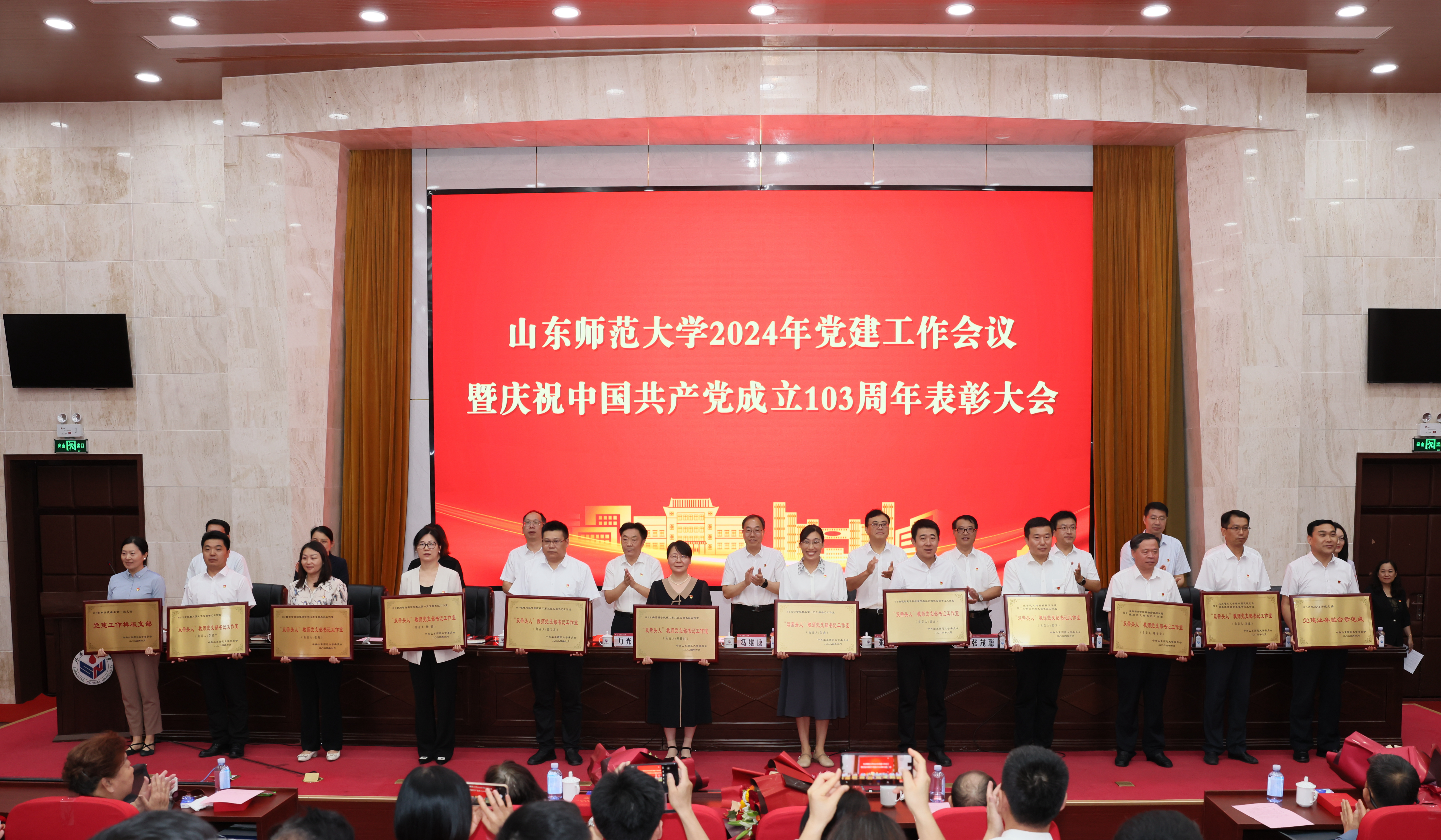 7月1日上午,山东师范大学2024年党建工作会议暨庆祝中国共产党成立103周年表彰大会在千佛山校区教学三楼报告厅隆重举行。会上,对2024年获评的党建工作标杆院系、样板支部、“双带头人”教师党支部书记工作室、党建业务融合示范点、党员先锋岗标兵和 党务工作者先锋岗标兵等进行了表彰。