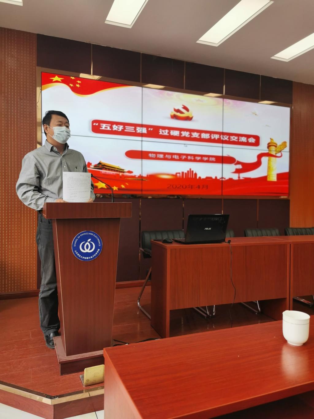 2020年4月21日下午,物理与电子科学学院于文澜楼A区347召开五好三强过硬党支部评议交流会,学院党委委员和全体支部书记参加交流评议。会议由学院党委副书记杜伟主持。