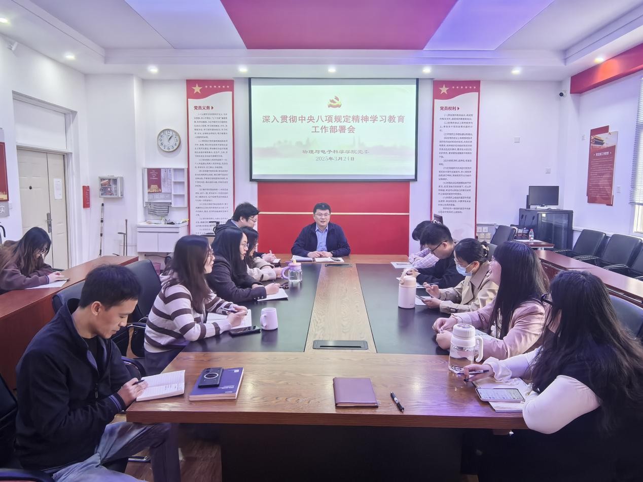 3月23日下午,物理与电子科学学院召开专题会议,认真学习领会习近平总书记关于加强党的作风建设的重要论述,集中学习中央八项规定及其实施细则精神,研究部署学院学习教育工作。党委书记谢德仁主持会议并讲话,全体班子成员出席会议。