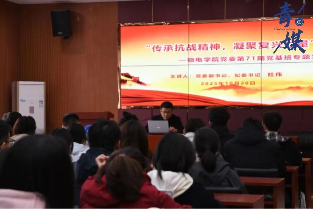 10月20日中午,物理与电子科学学院于文澜楼A区F347室召开“传承抗战精神,凝聚复兴力量”主题党课,本次党课由党委副书记、纪委书记杜伟担任主讲人,2024级辅导员苏恒担任主持人,学院第71期党基班56人参加学习本次党课。