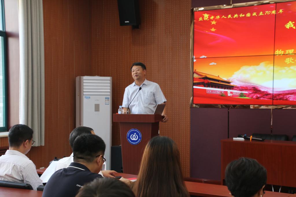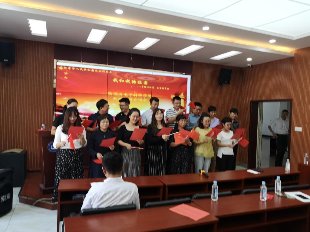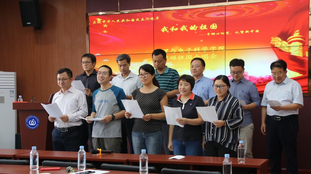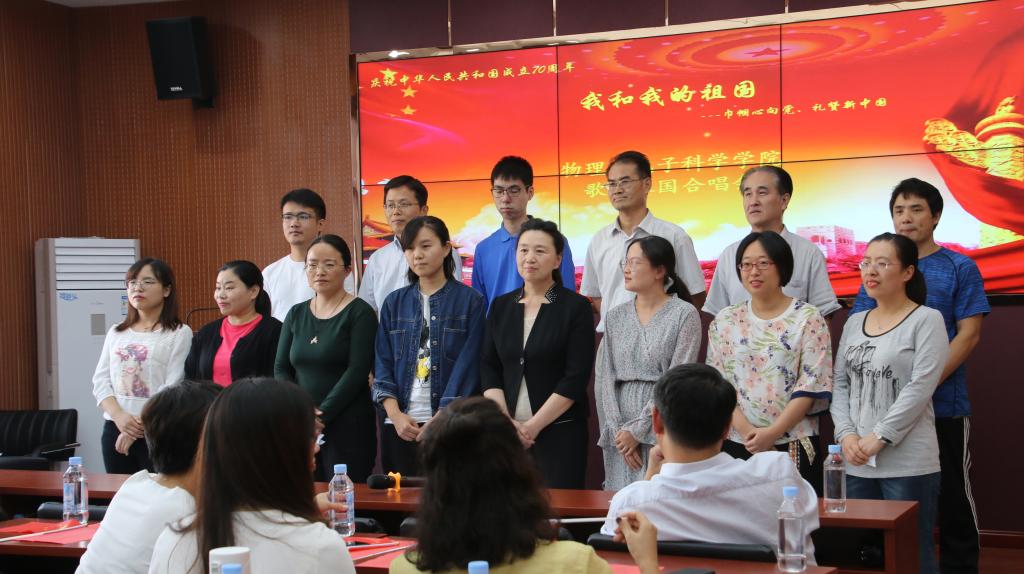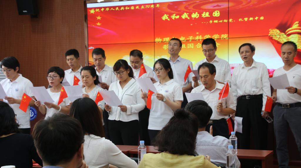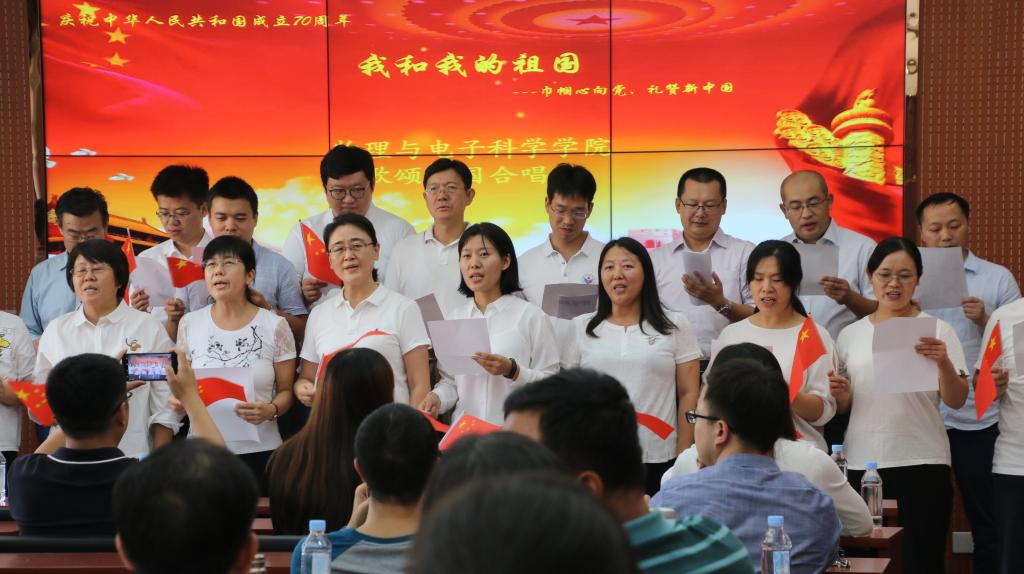 9月26日中午,物理与电子科学学院在文澜楼A区F347教室举行“我和我的祖国”合唱歌会。物电学院党委书记谢德仁、副书记杜伟、副院长赵曰峰、任俊峰、宋玉志出席活动,学院全体教职工和部分学生参加了合唱会。学院工会主席修显武主持活动。
