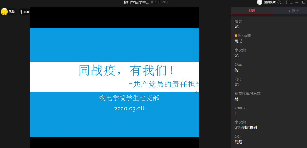 各党支部利用学习强国、灯塔系统、QQ群等网络平台开展理论学习活动,以适当方式开展线上“三会一课”,集中学习习近平总书记关于新冠肺炎疫情防控的重要讲话精神,为打赢疫情防控阻击战坚定信心。学生第一支部组织开展“提升党性修养,坚定必胜信念”主题活动,34名党员学习撰写学习心得体会,明确疫情防控重要性和紧迫性,提高自身思想认识。学生第七支部线上开展“同战疫,有我们”主题党课,分享疫情防控中共产党人的典型事例,展现共产党员的责任担当,激励支部党员为疫情防控做出自己的贡献。学习活动还吸收了部分入党积极分子参加,注重特殊时期的教育培养,引领他们以实际行动为疫情防控工作做出贡献。