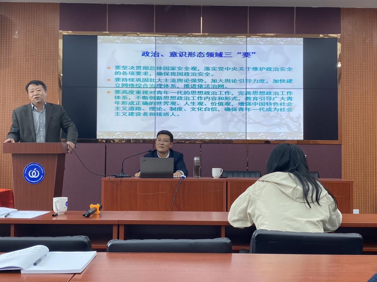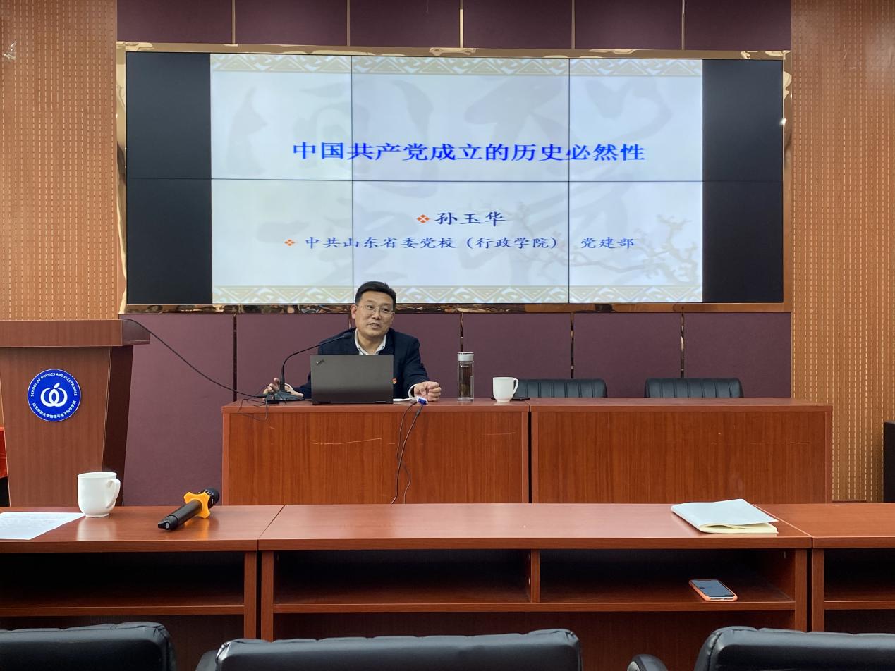 4月1日下午,物理与电子科学学院于文澜楼F347报告厅举行党史学习教育专场报告,中共山东省委党校(行政学院)党建部副教授孙玉华受邀作“中国共产党成立的历史必然性”报告。报告会由党委书记谢德仁主持,学院党委委员、各党支部支委会成员及部分教工党员参加了报告会。