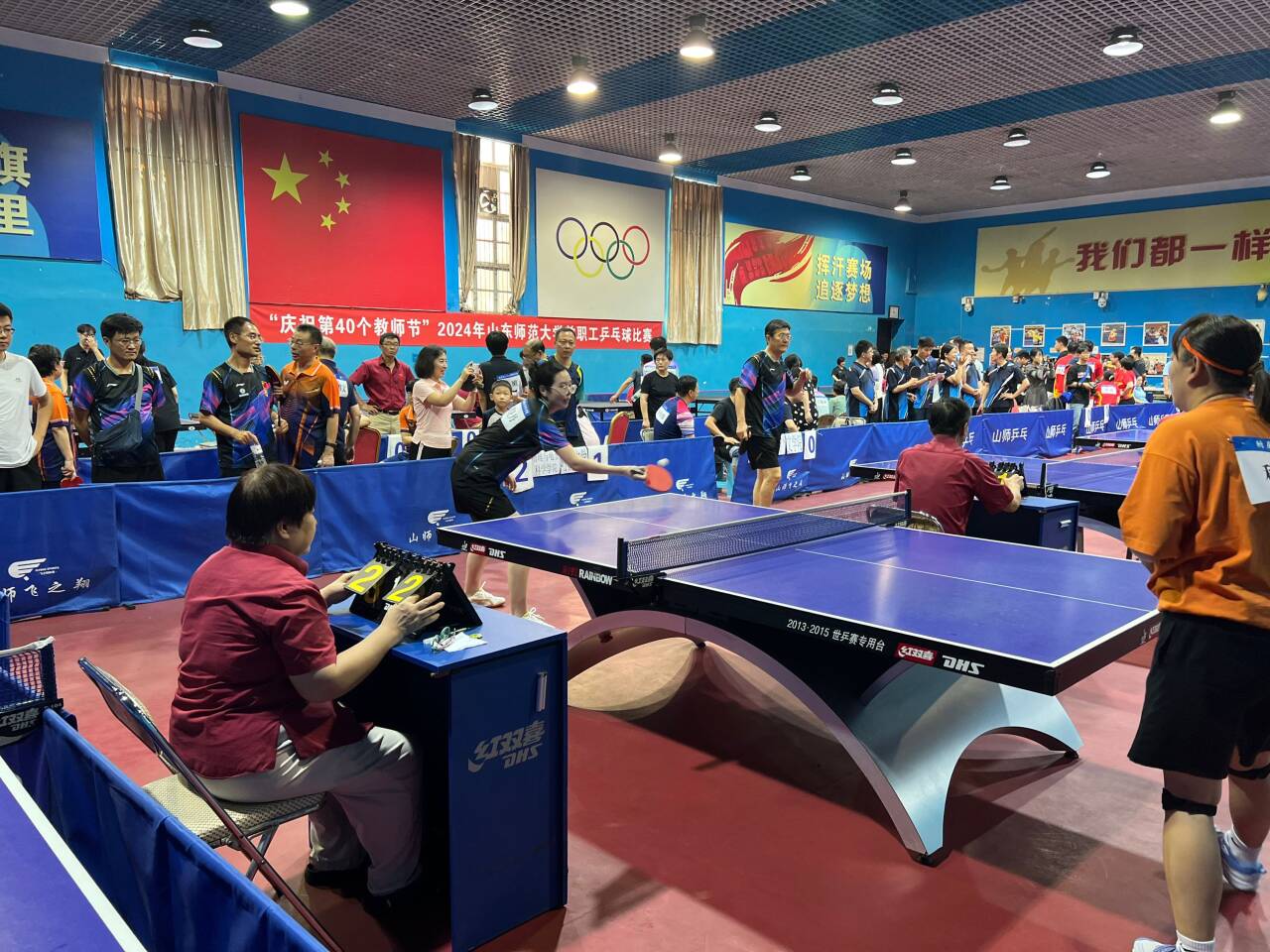 为迎接第40个教师节,9月7日,由学校工会(妇委会)主办、体育学院承办的山东师范大学2024年“奋力‘乒’搏新时代 勇‘乓’高峰创一流”教职工乒乓球比赛在千佛山校区成功举行。校党委副书记出席闭幕式并为获奖单位颁奖。
