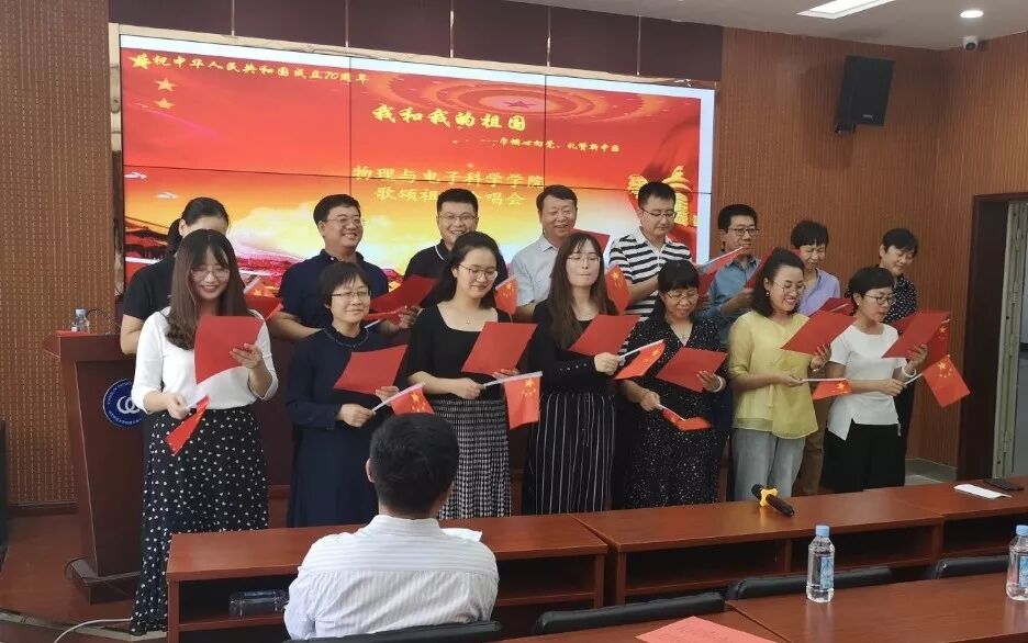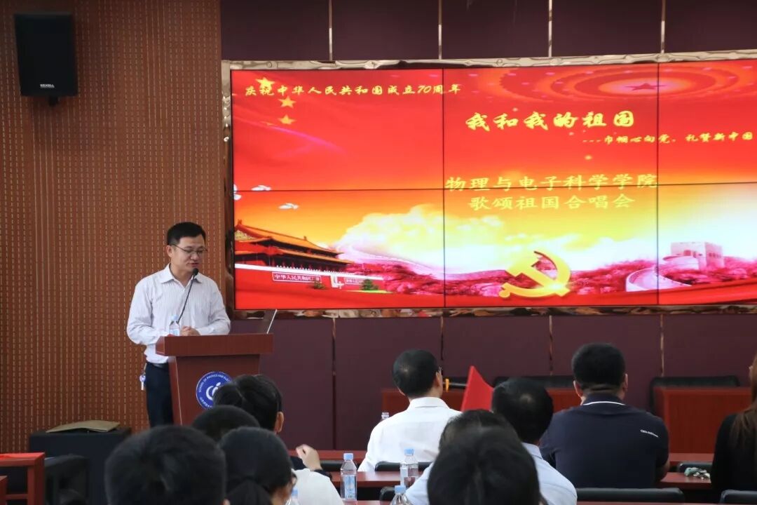 9月26日中午,物理与电子科学学院在文澜楼A区F347教室举行“我和我的祖国”合唱歌会。物电学院党委书记谢德仁、副书记杜伟、副院长赵曰峰、任俊峰、宋玉志出席活动,学院全体教职工和部分学生参加了合唱会。学院工会主席修显武主持活动。