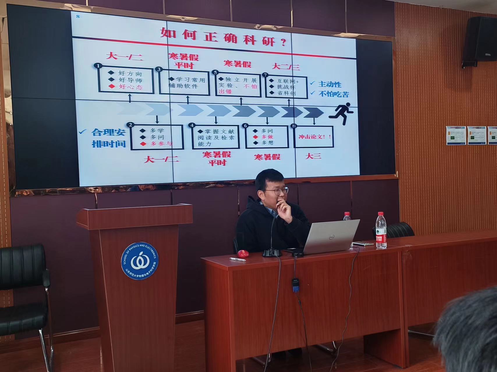 3月24日上午,物理与电子科学学院于文澜楼A区F347会议室举办 “浅谈本科生的科研”的主题讲座。物电学院学院副教授郁菁担任主讲,物电学院22级62名学生参加本次讲座。